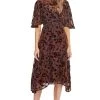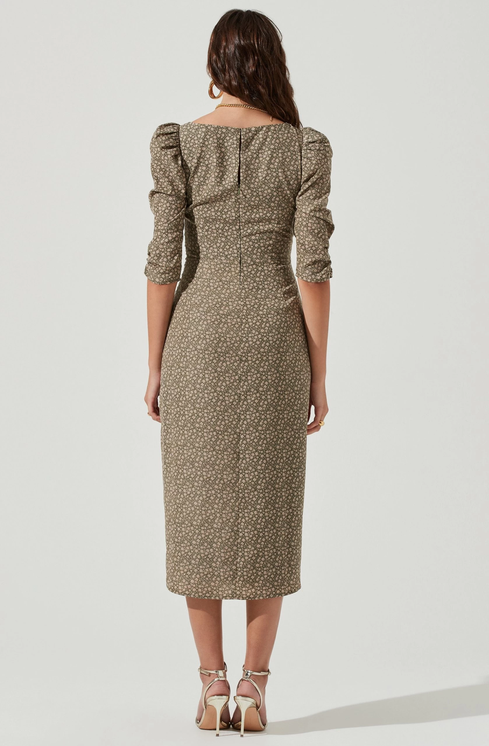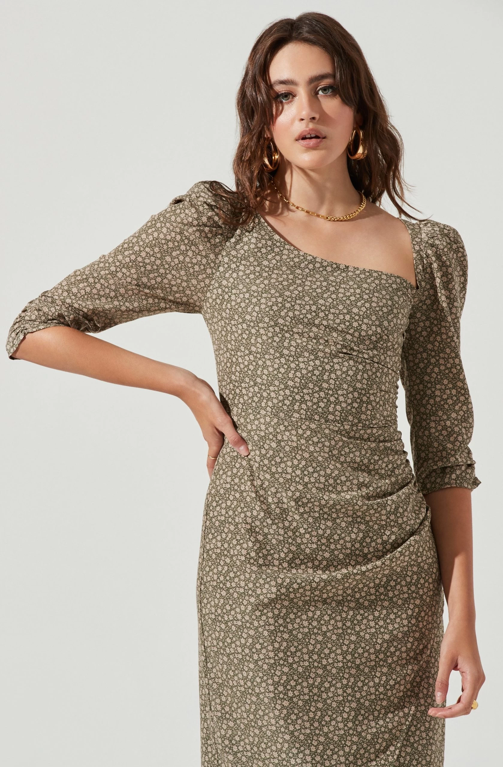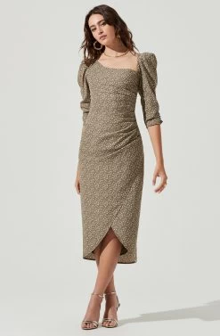 This romantic midi dress features an asymmetrical neckline with 3/4 puff sleeves. Gathered bodice leads to a wrapped midi skirt with a front slit accent. Keyhole back.