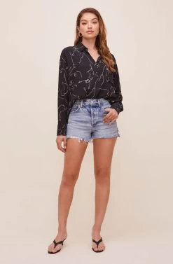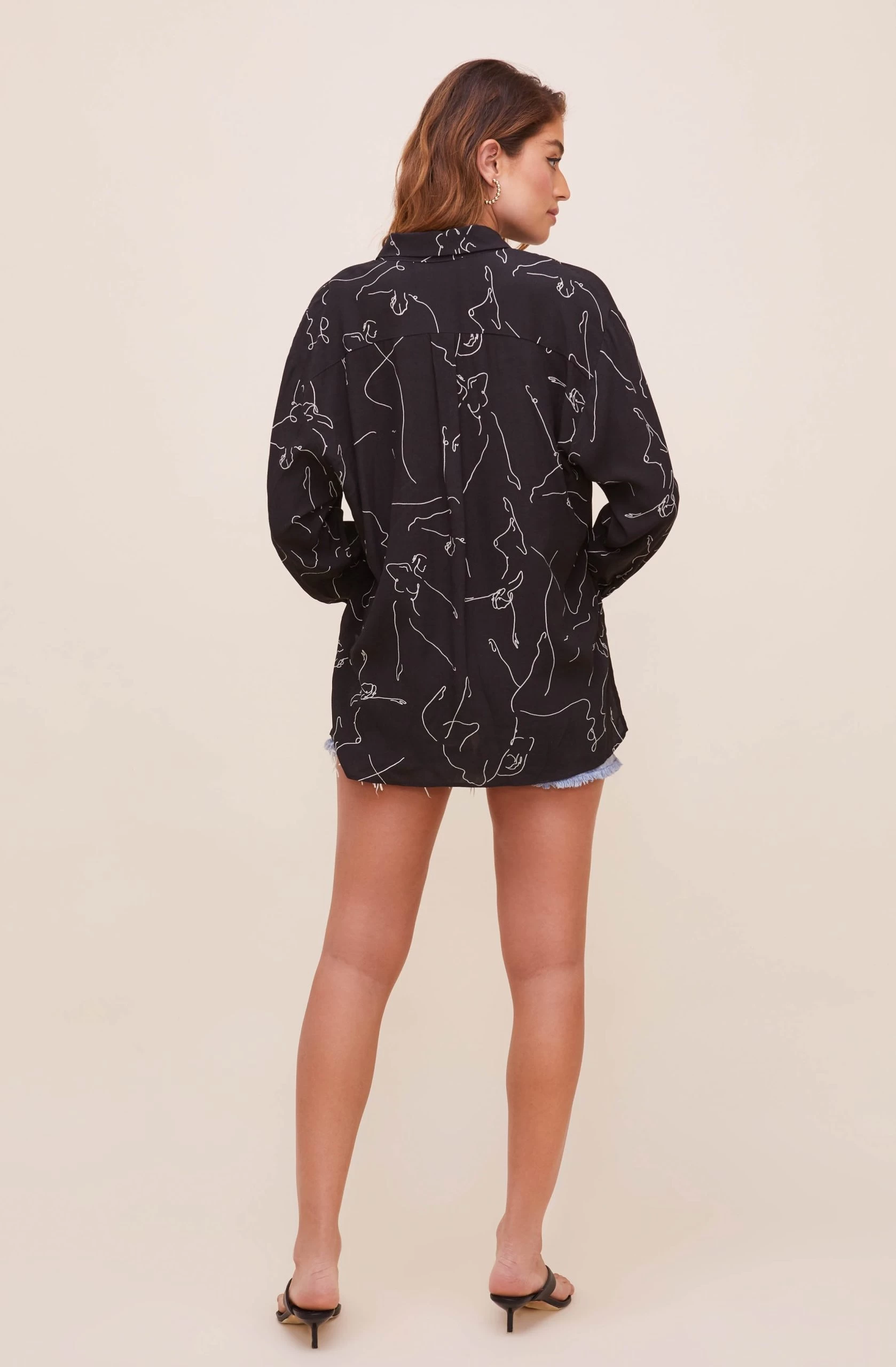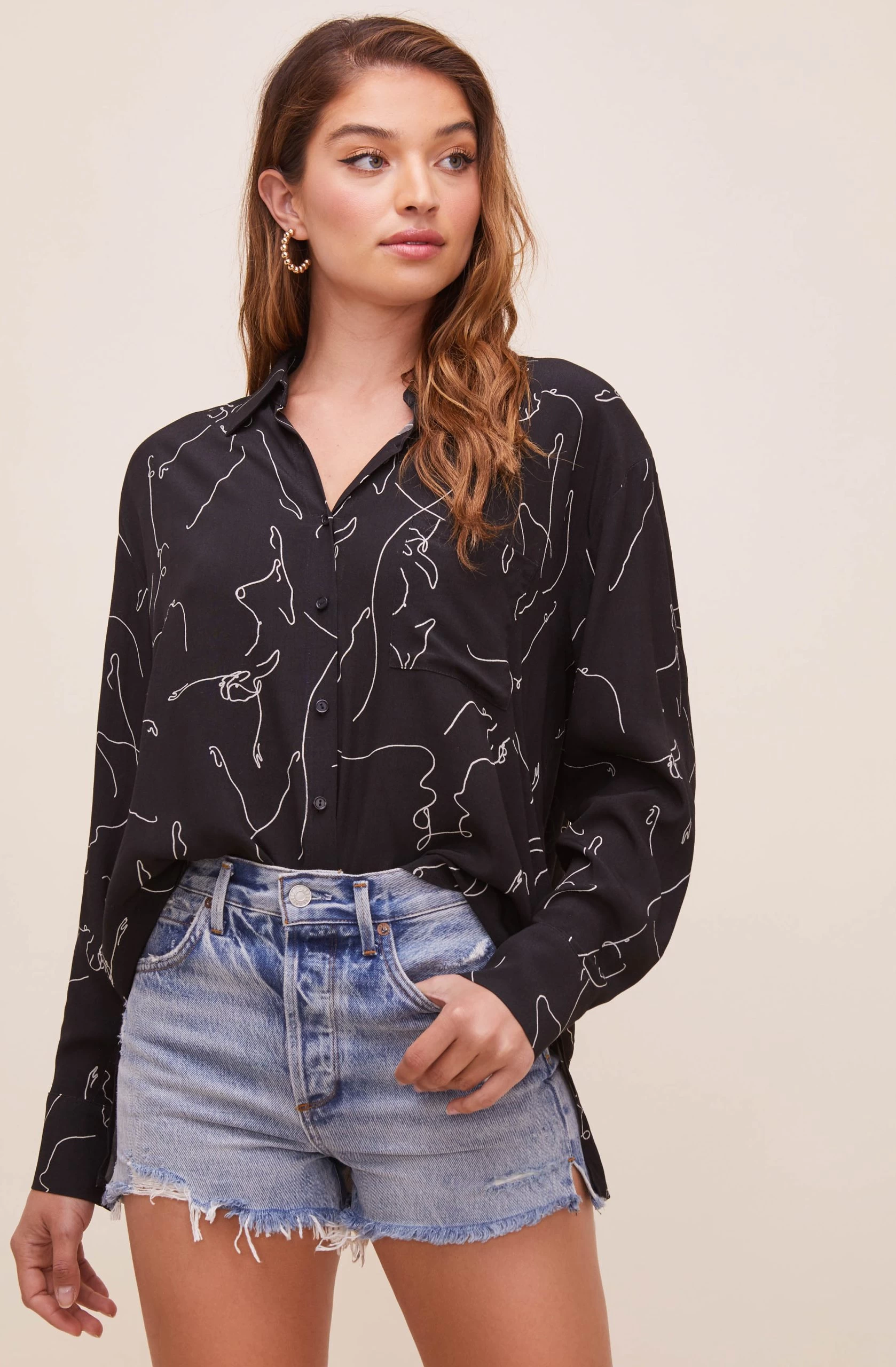 Elevate your daily ensemble with a sleek blouse. Pointed collar leads down to a front button placket and hi-lo hemline. Decorated with an abstract ballet dancer print for an element of chic. Long sleeves with buttoned cuffs and front patch pocket accent.
