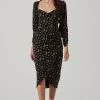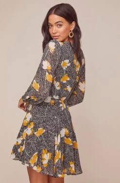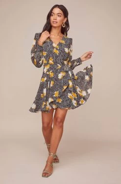 Spring forward in style! This mini dress features a wrap front, cinched waist and long statement sleeves. Wrap skirt. Bright floral print throughout.