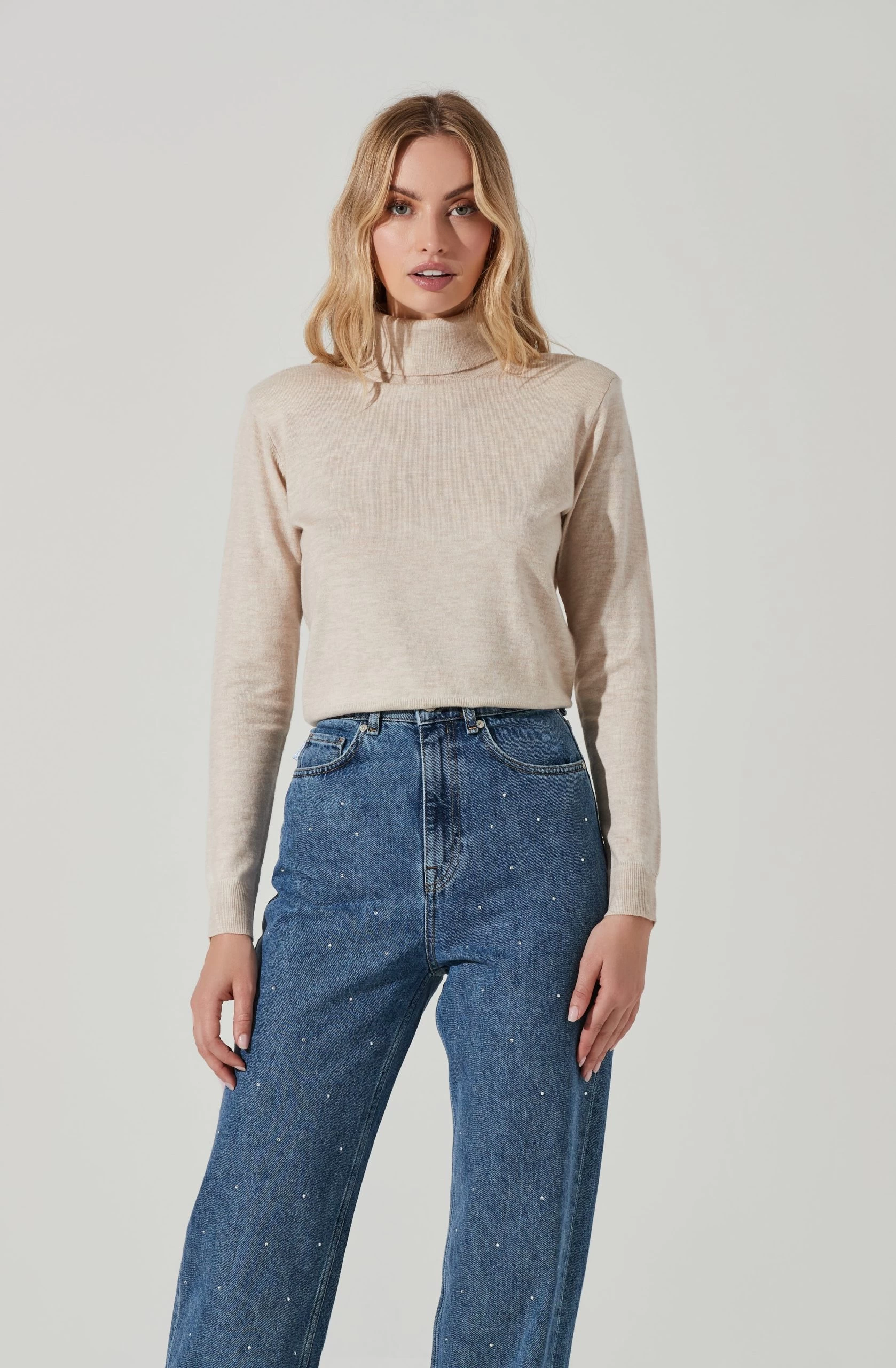 The Alden Sweater features a ribbed knit construction. Turtleneck leads to lightly padded shoulders. Long sleeves.