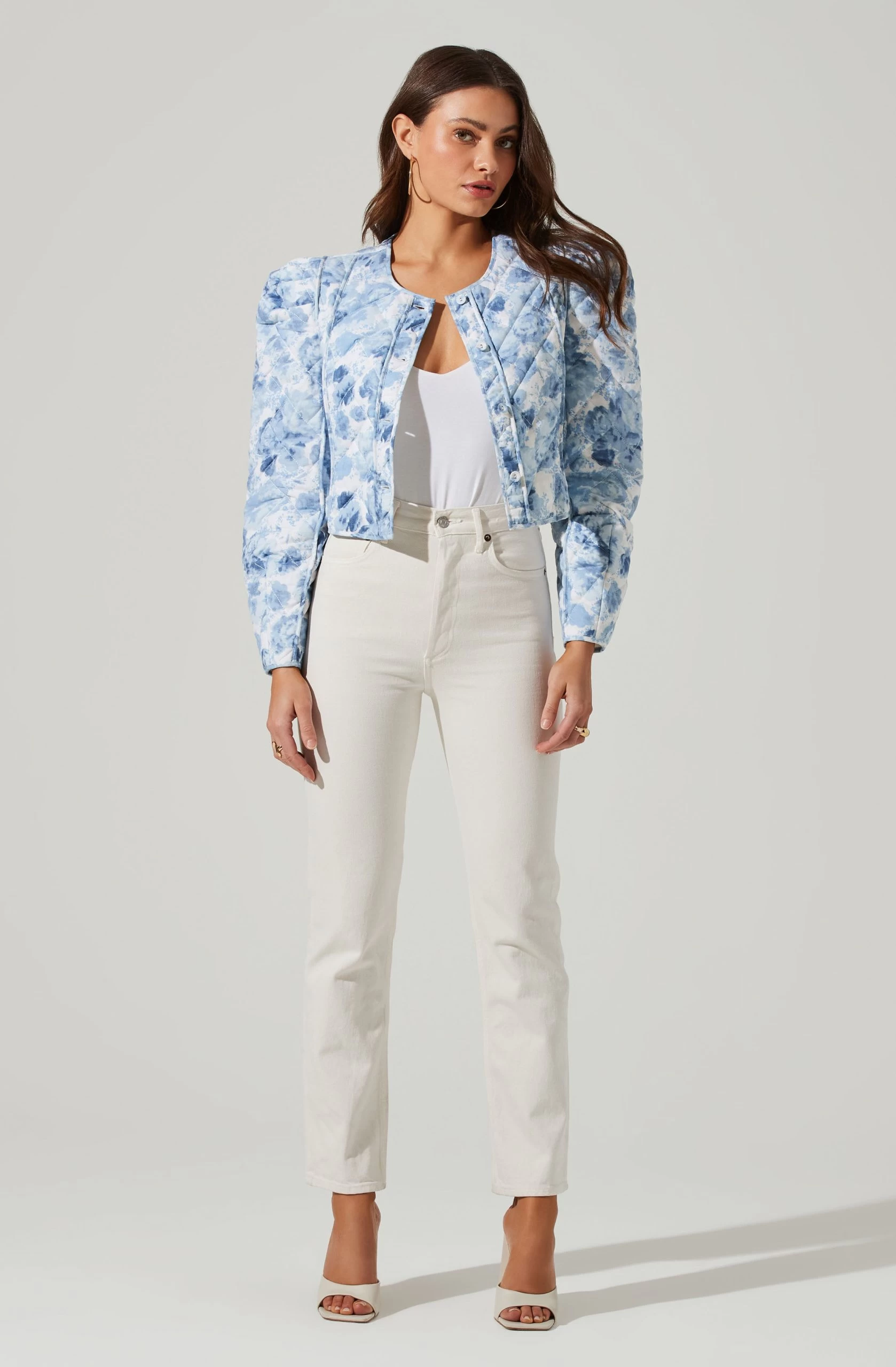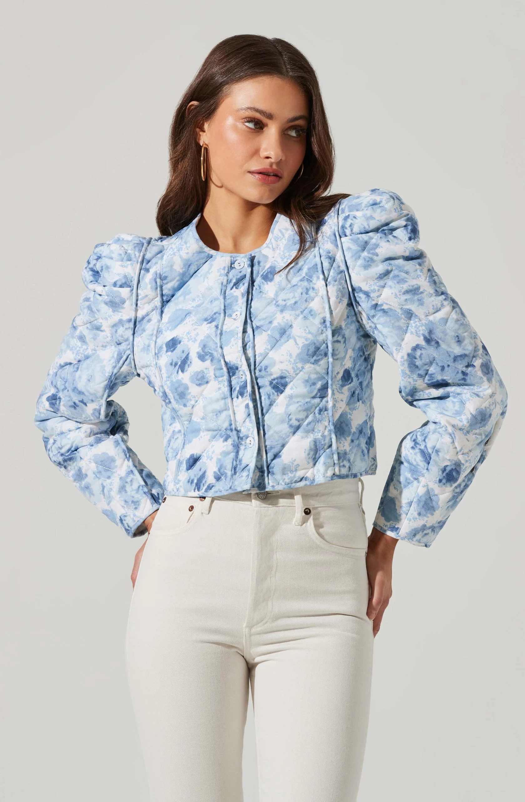 The Alena Jacket features a statement abstract print and intricate quilted finish. Round collarless neckline leads to a buttoned front and cropped hem. Long sleeves and puff shoulders.