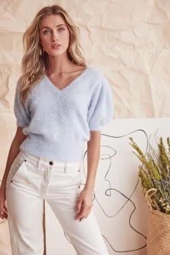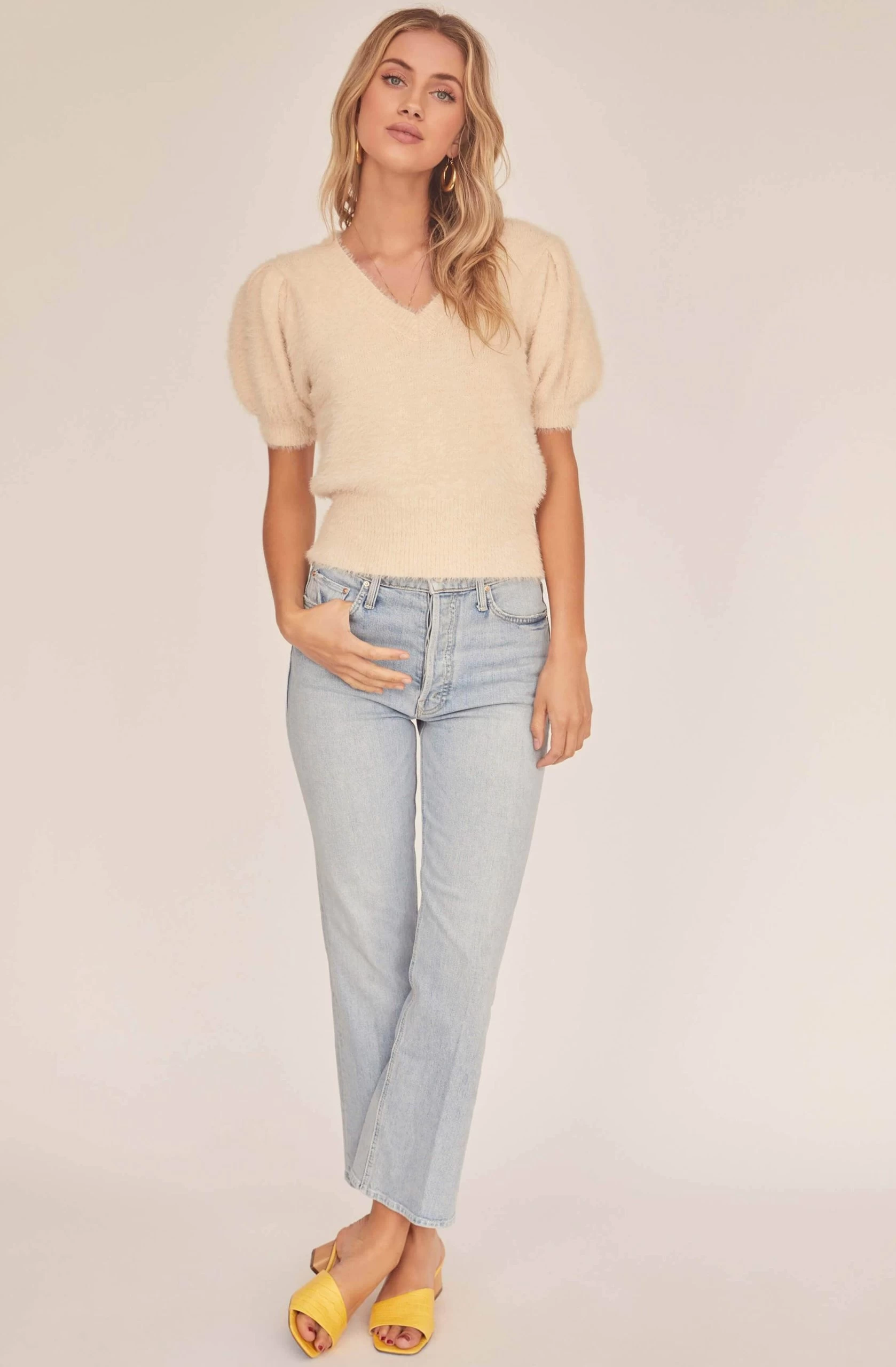 Soft details make the Alina sweater a wardrobe must-have. Featuring a fuzzy mohair fabrication, this sweater starts with a flattering V-neck, ribbed waistband and short puff sleeves.