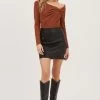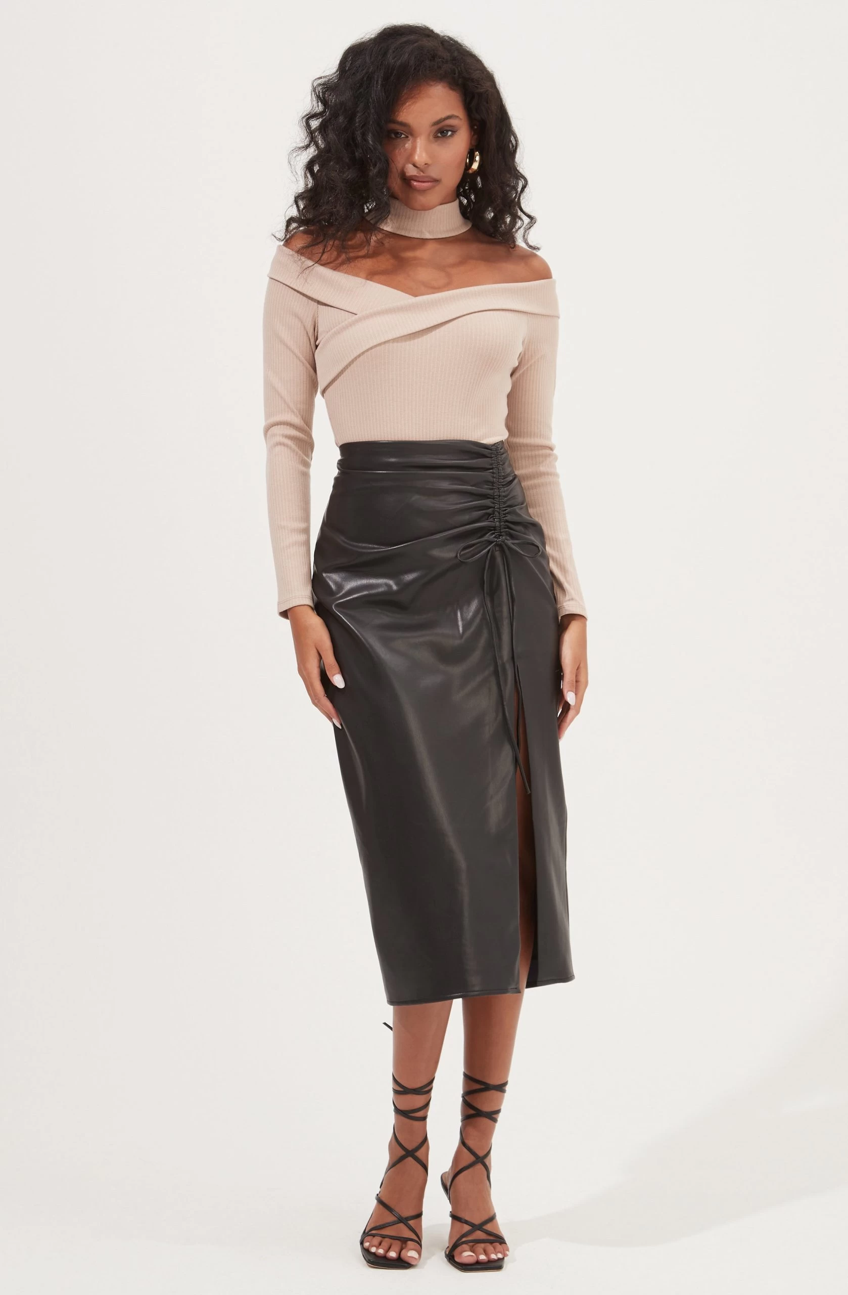 The Alondra Skirt features a faux leather construction. High waist leads to a ruched design with drawstring accents. High front slit detail. Midi length. Concealed back zip closure.
