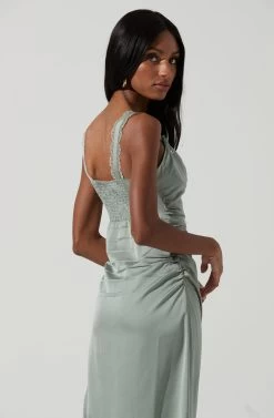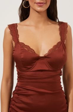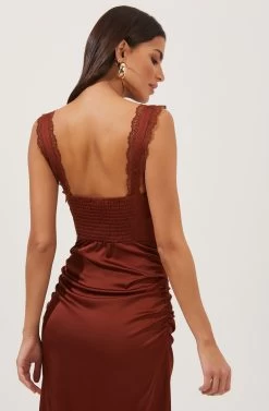 The Alva Dress features a soft-as-satin construction with a sweetheart neckline. Shoulder straps and neckline features lace trim. Bustier top features supporting wiring. Smocked back. Midi length skirt with side split hem.