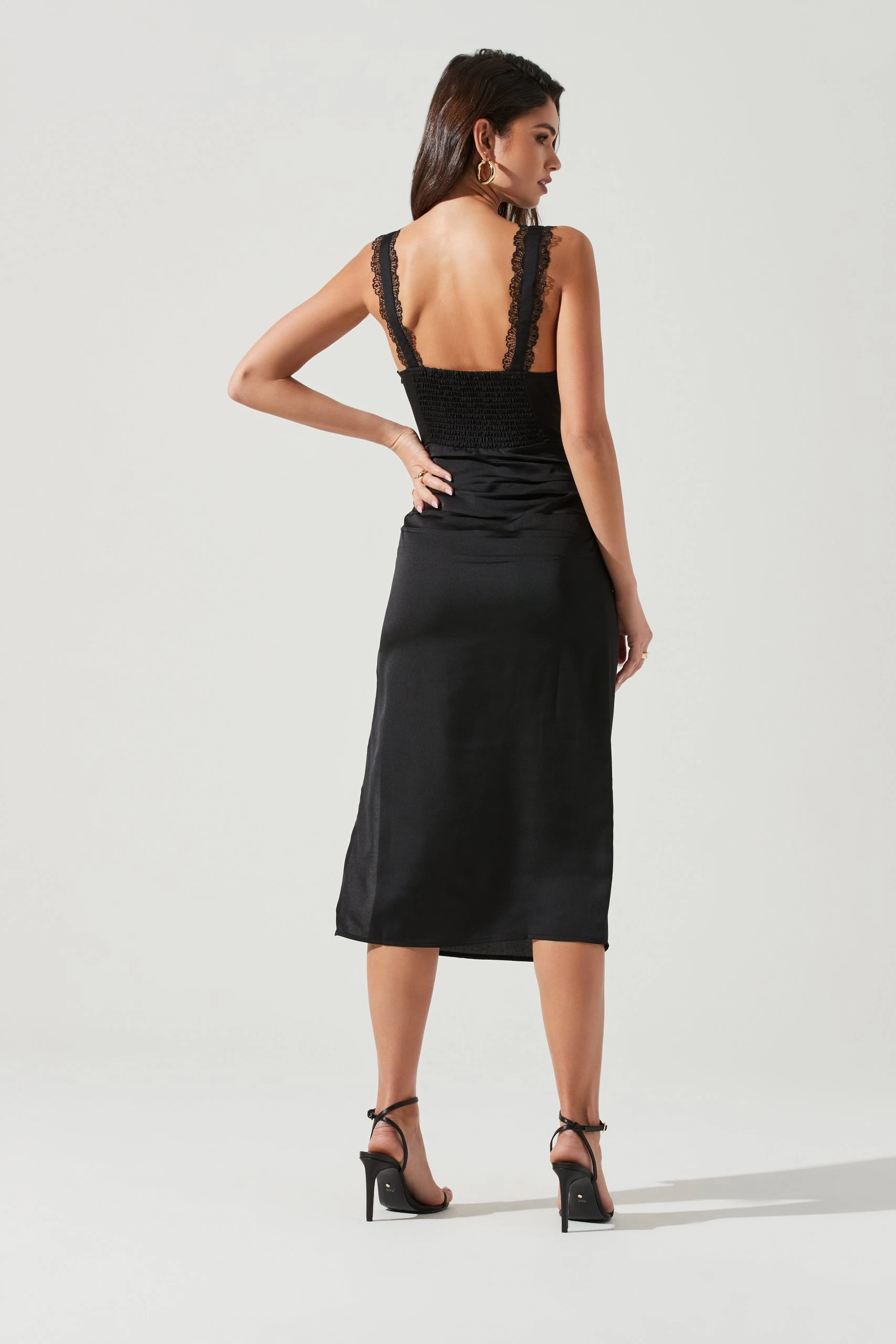This sexy number features a sweetheart neckline with a lace trim along the bust and shoulder straps. Fitted bodices descends to ruched detailing at the hips. Midi-length skirt.