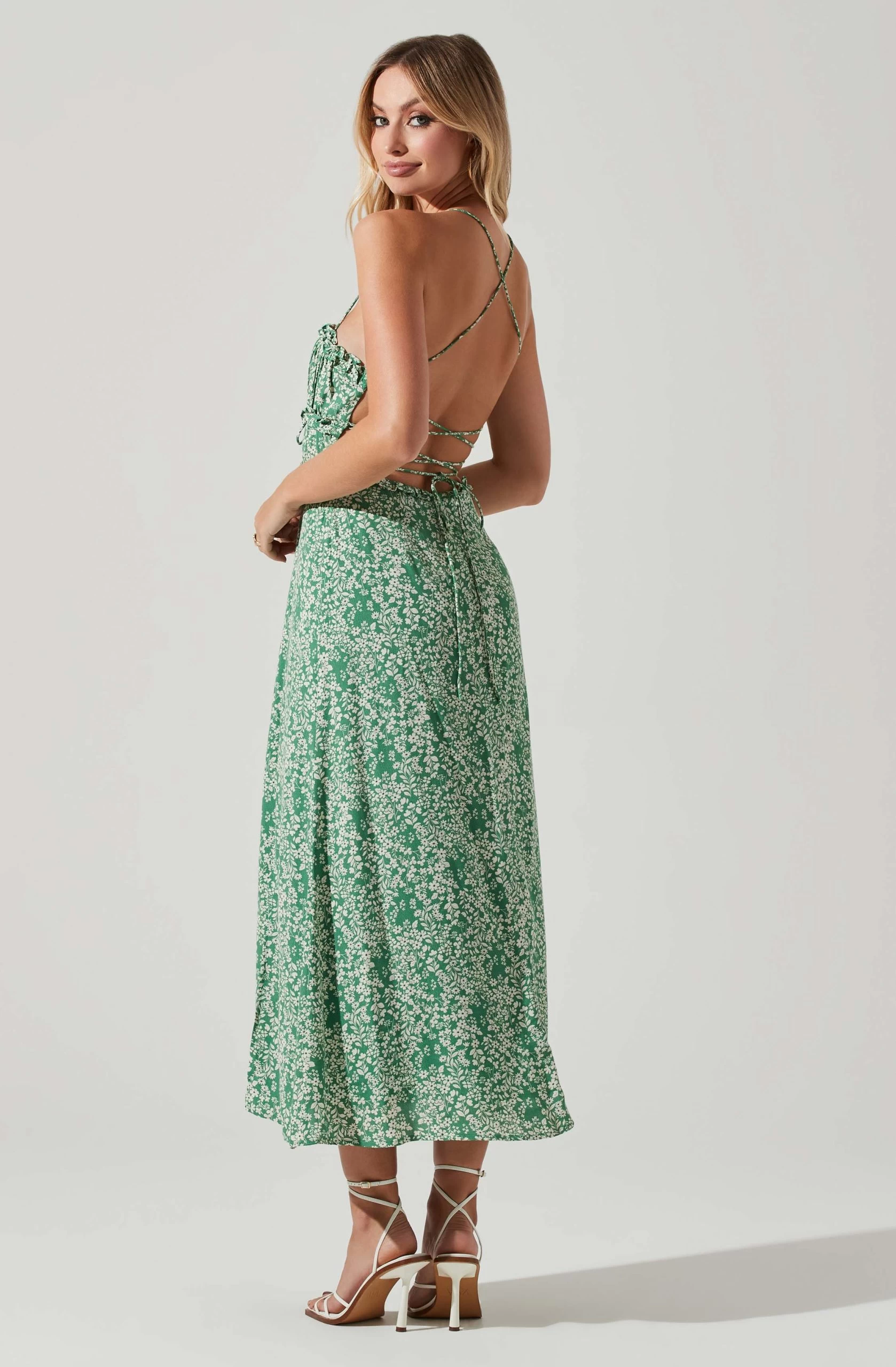 This dress features a floral print throughout. Sweetheart neckline leads to a smocked bodice and cutout accent at the bust. Side slit accent. Smocked back and straps.