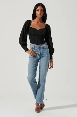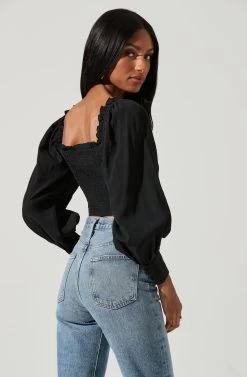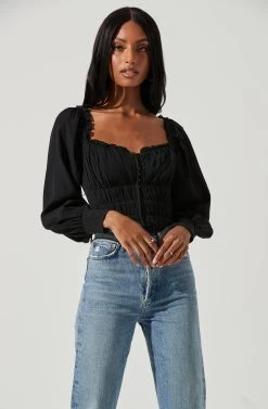 Perfection achieved. This top features a ruffle-trimmed sweetheart neckline that leads to a textured corset-style bodice with hook-and-eye closures. Supportive boning on the sides. Long puff sleeves with button cuffs. Smocked back.