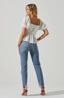 The Amoura Top features an eyelet construction. V neckline leads to a shirred bust and peplum hem with a scalloped edge. Short puff sleeves.