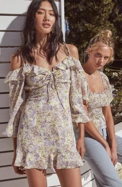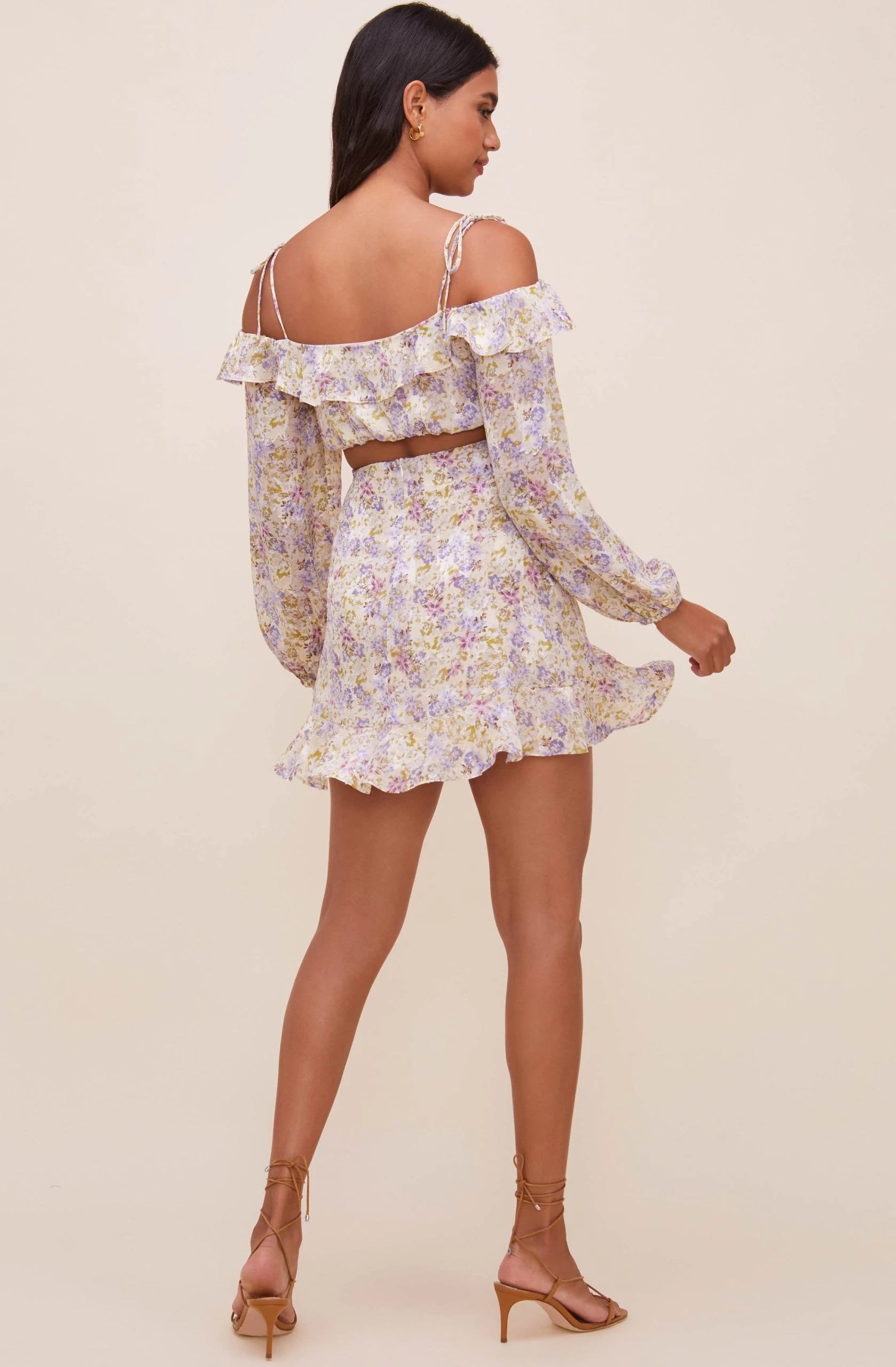 Forever in your heart. This sweet mini dress features an off-shoulder neckline that leads to a shirred bust with ruffle trim along the neckline and drawstring accent. Ditzy floral print cheers up this silhouette. Cutout detail on the back. Long sleeves.