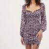 The Aneira Dress features a multi-floral print throughout. Deep plunge neckline leads to a cinched front with a drawstring accent. Tiered skirt. Open, low-cut back features tying straps.