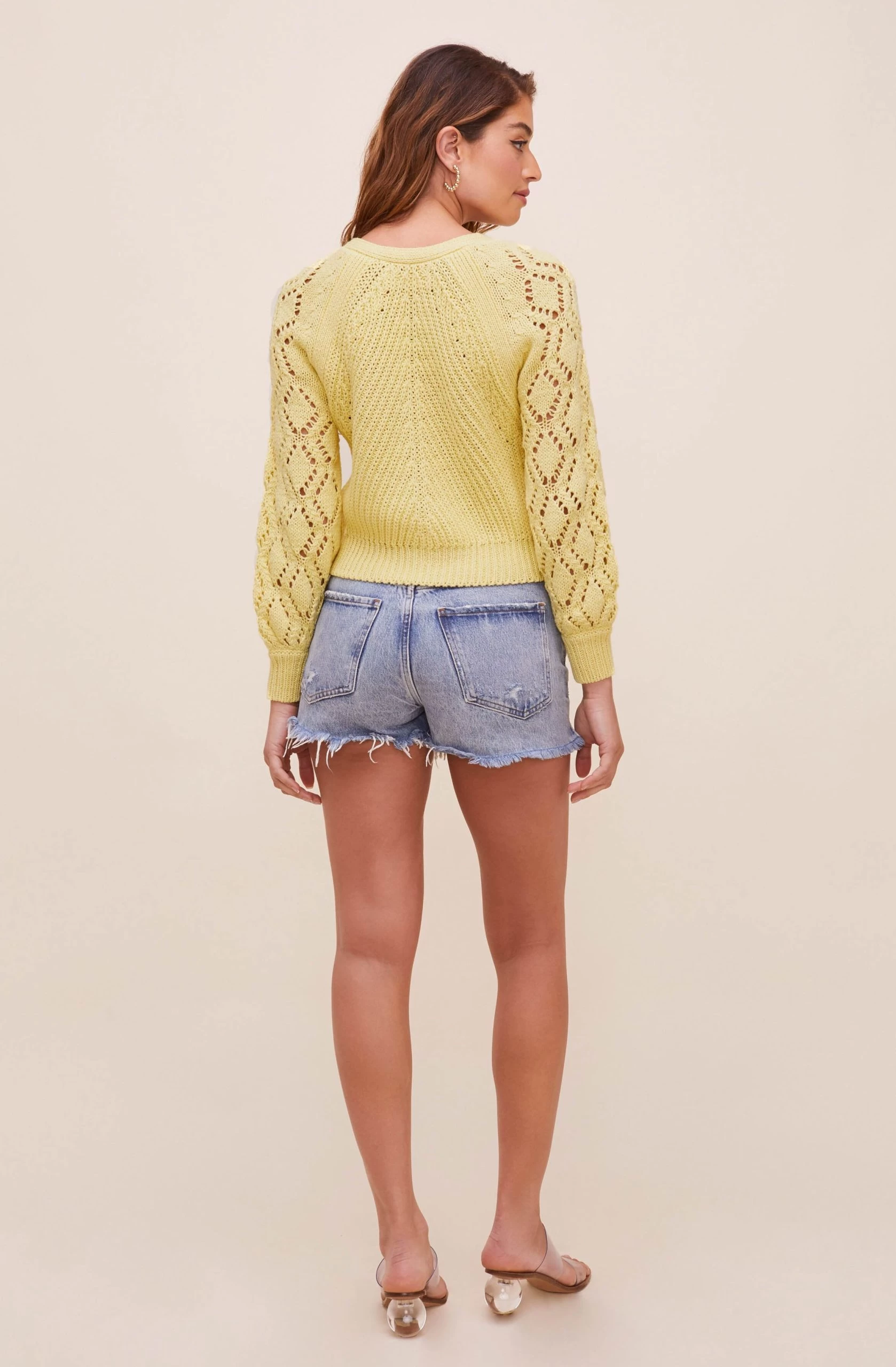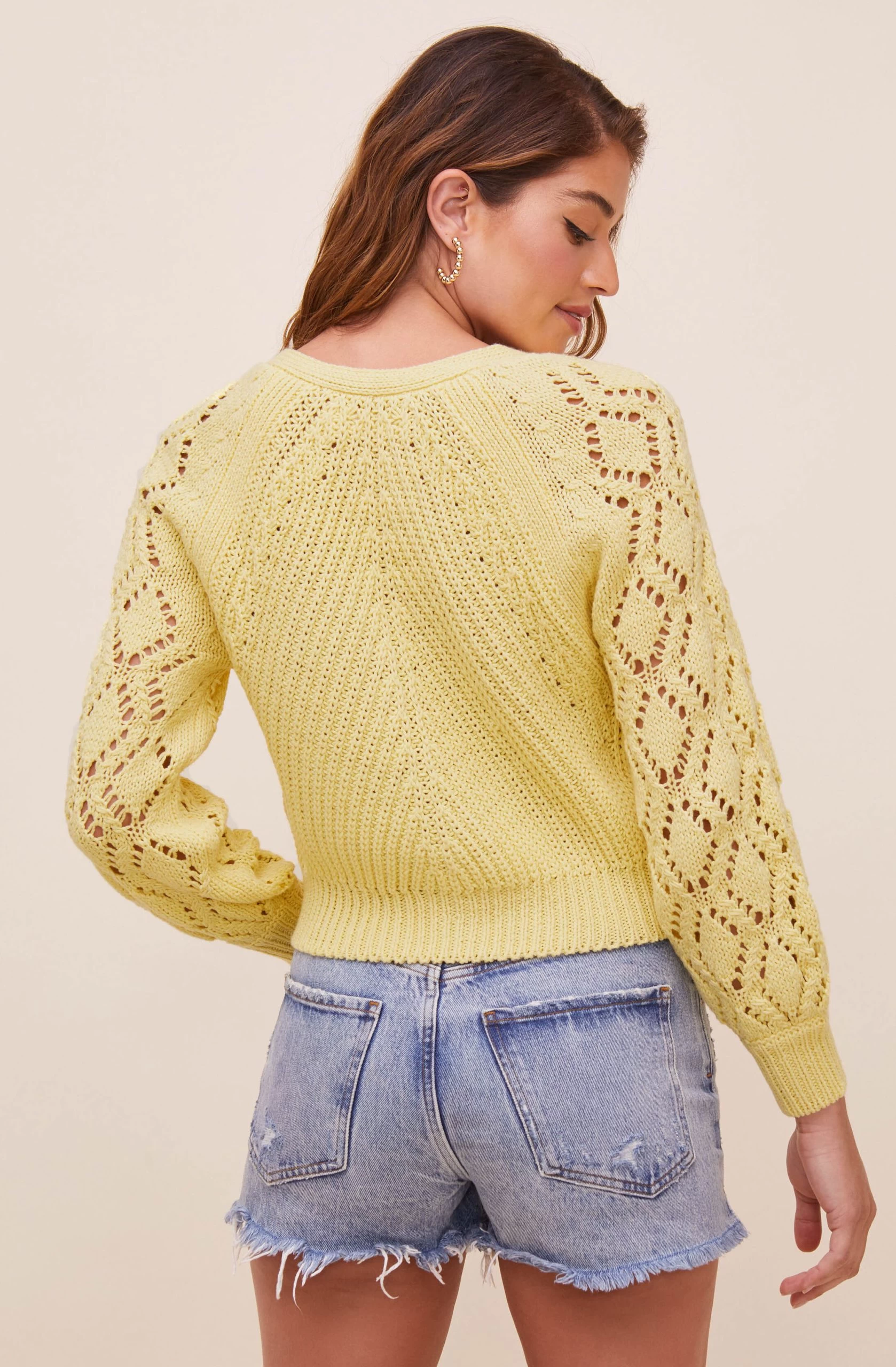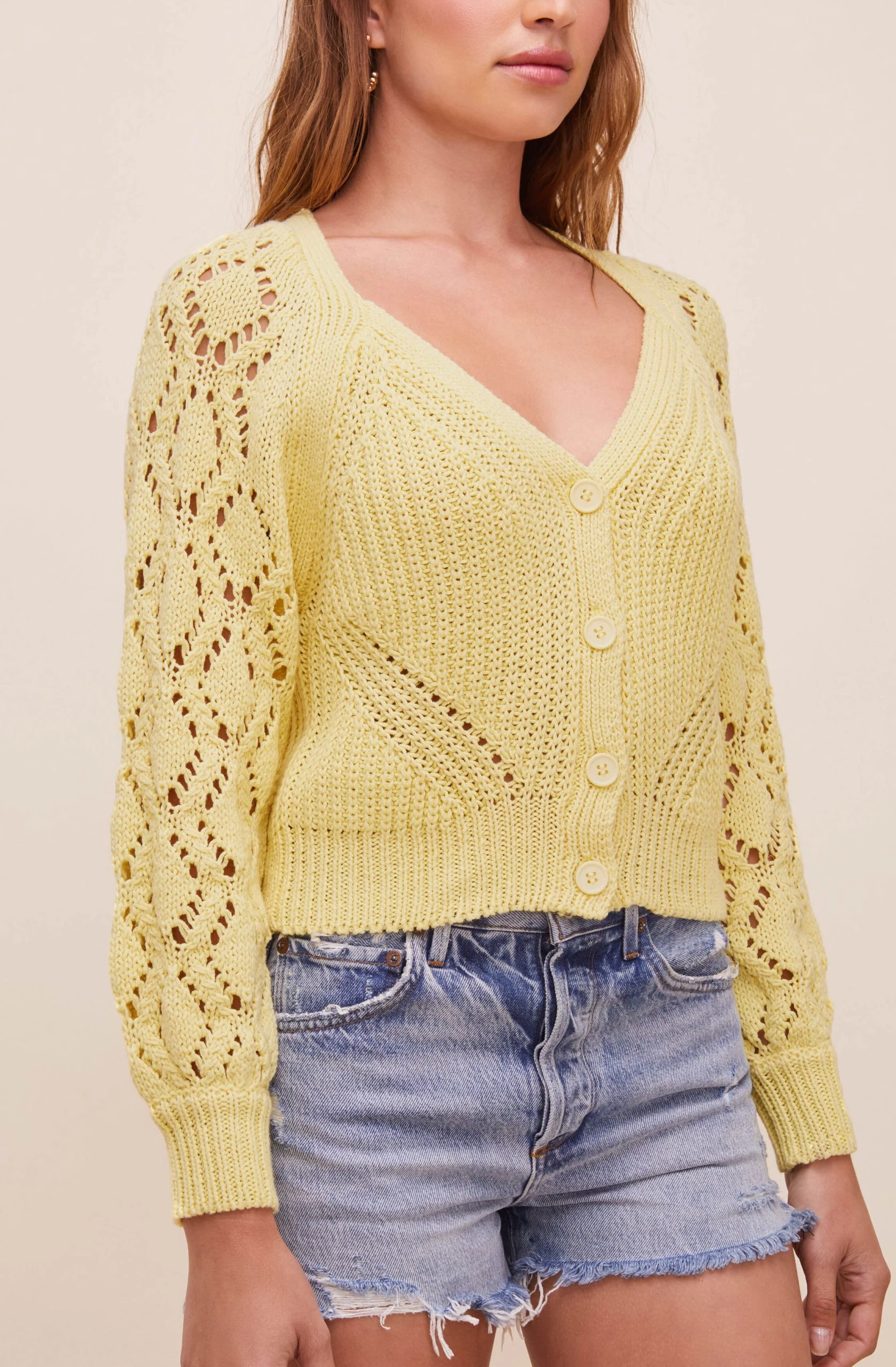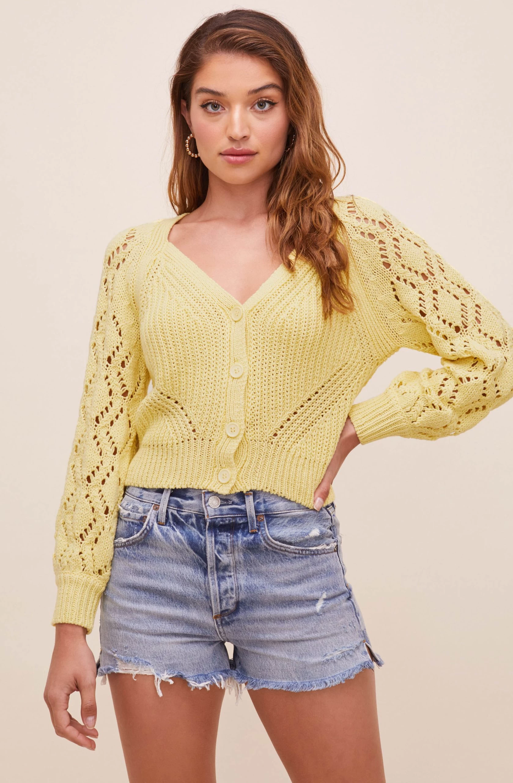 All the knits, all the time. This cardigan features a V neckline that leads to a front button placket. Long pointelle knit sleeves adds a touch of sweet elegance.