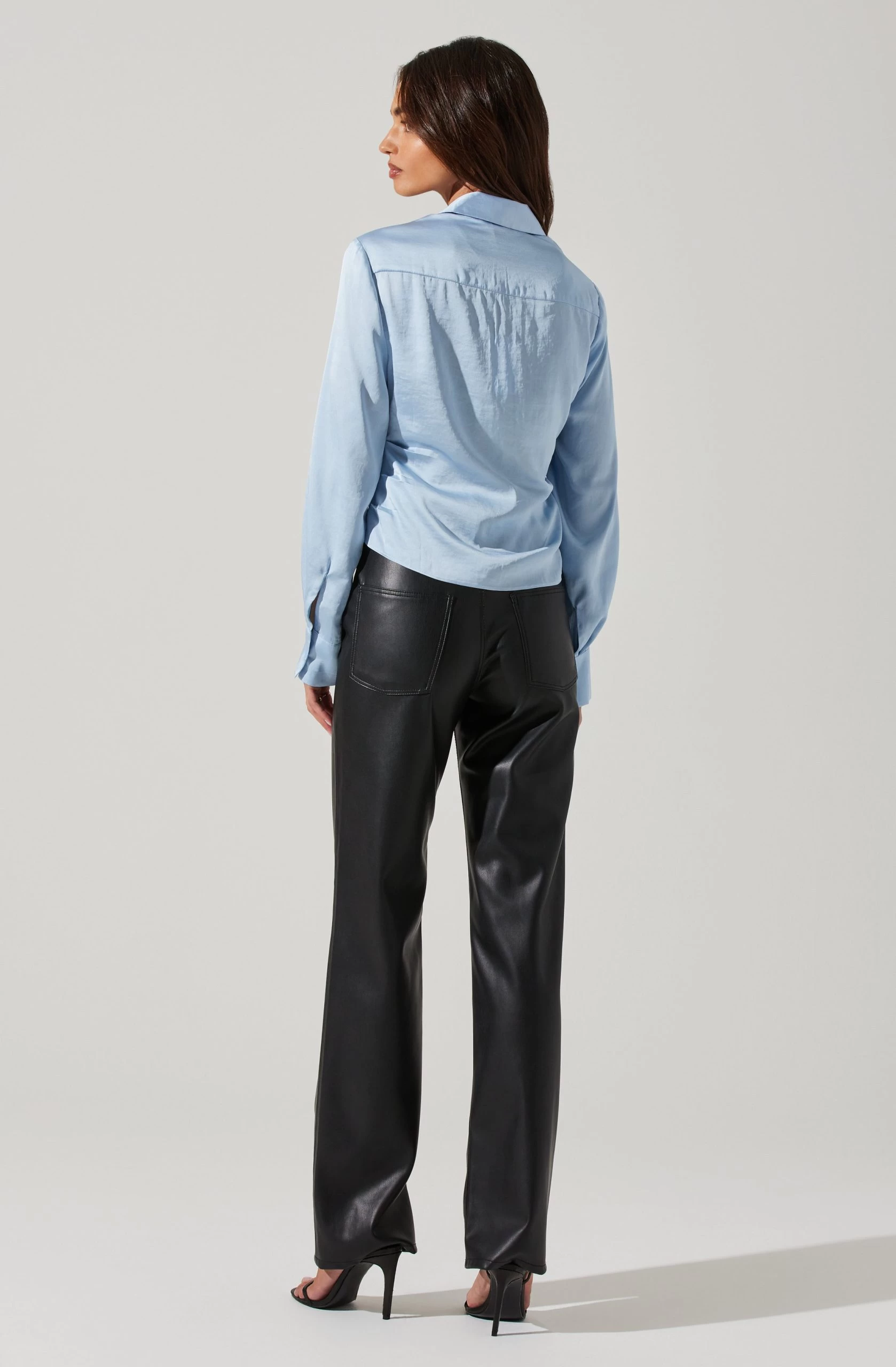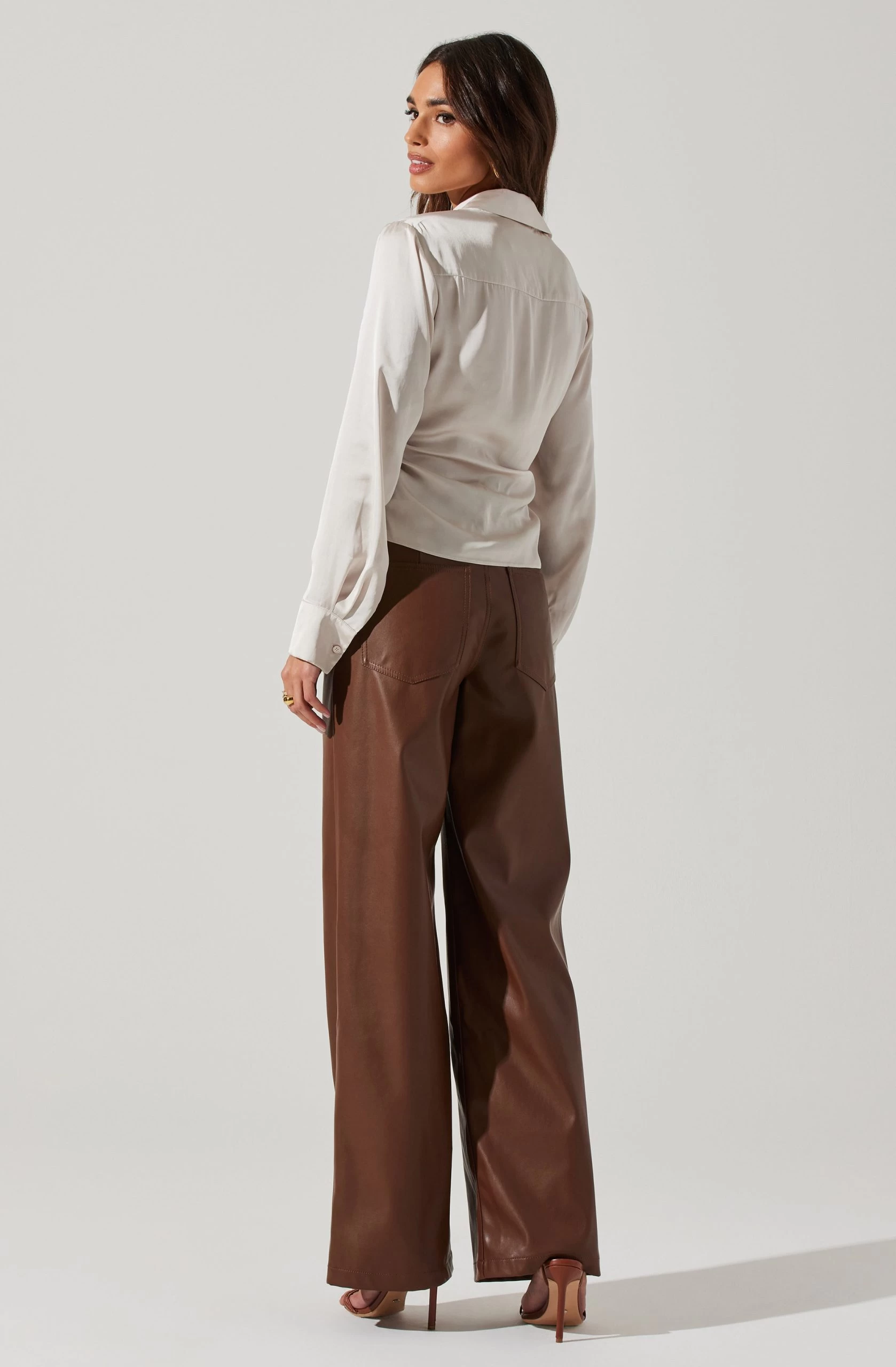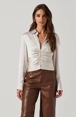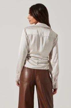 The Angelina Top features a satin finish. Pointed collar leads to a V neckline and ruched front. Long sleeves.