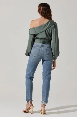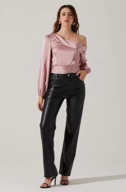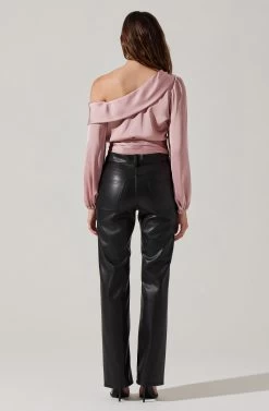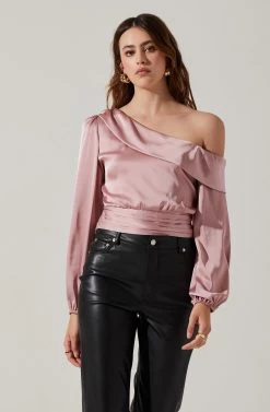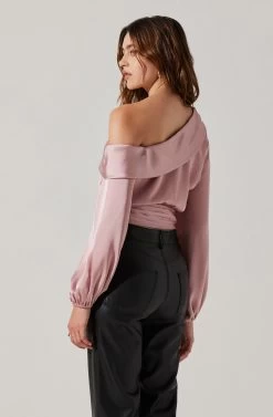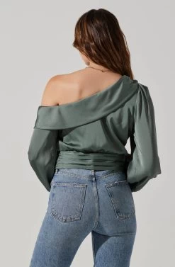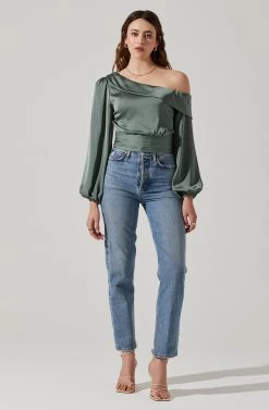 This satin-finish top features an off-shoulder neckline with a draping effect. Long sleeves. Buttoned cuffs. Cropped banded hem.