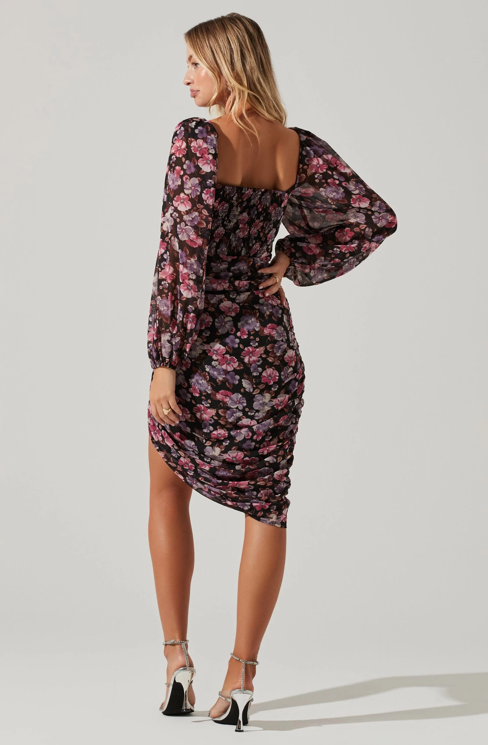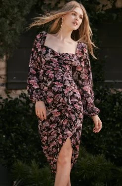 The Athens Dress features a bold-yet-romantic floral print. Sweetheart neckline leads to a ruched bodice with a ruffle trim accent. Midi-length asymmetrical skirt. Long puff sleeves. Smocked back.