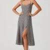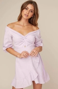 All about ruffle! The Aubrey Dress is perfect for sunny days. It features an off-shoulder neckline that leads to a twist bodice and defined waist. Ruffle mini skirt and three-quarter puff sleeves. Tie waist accent.
