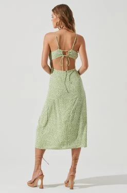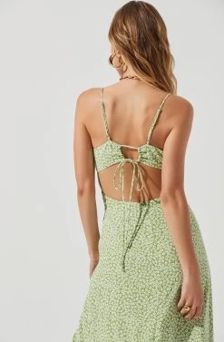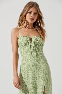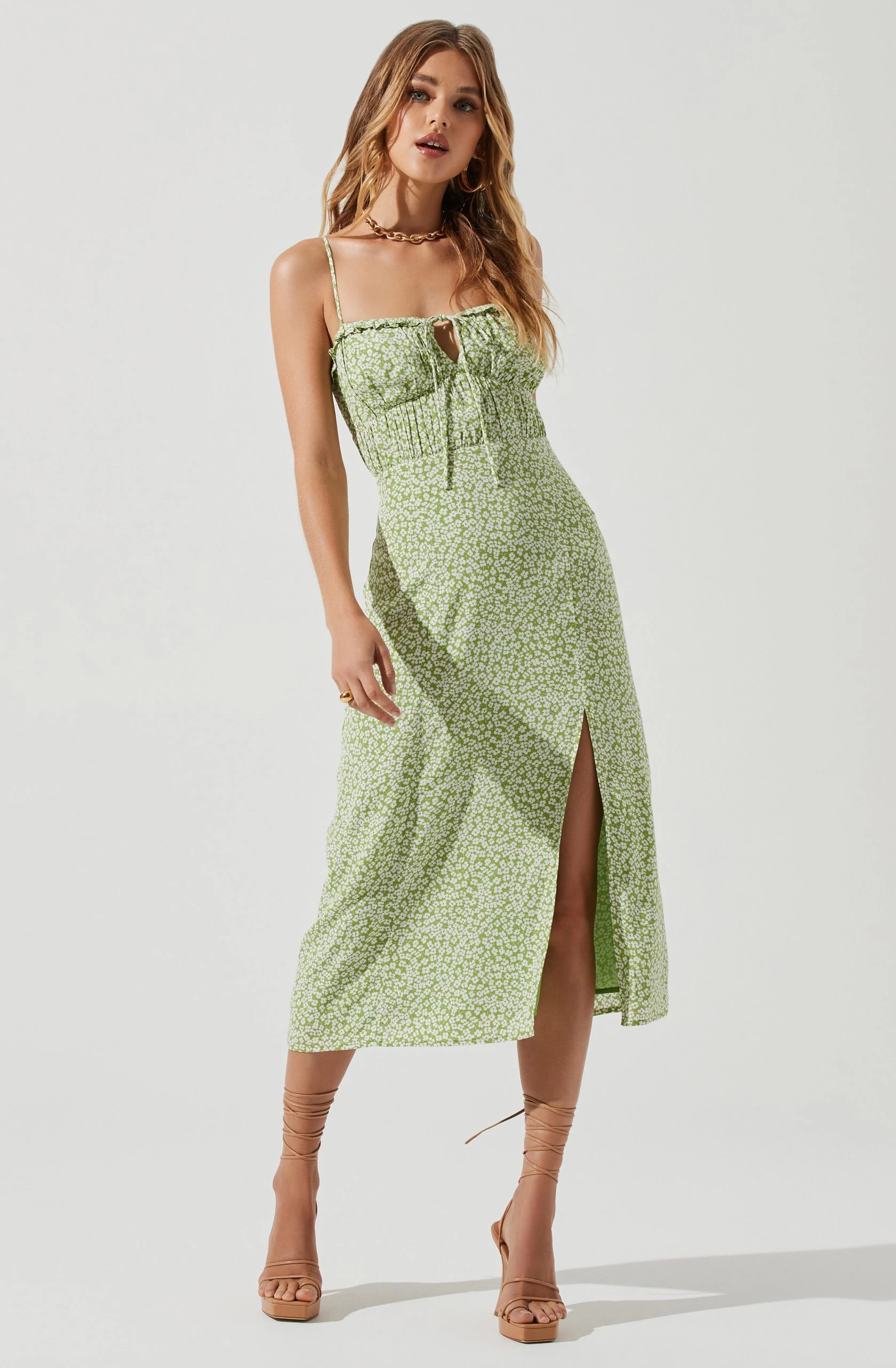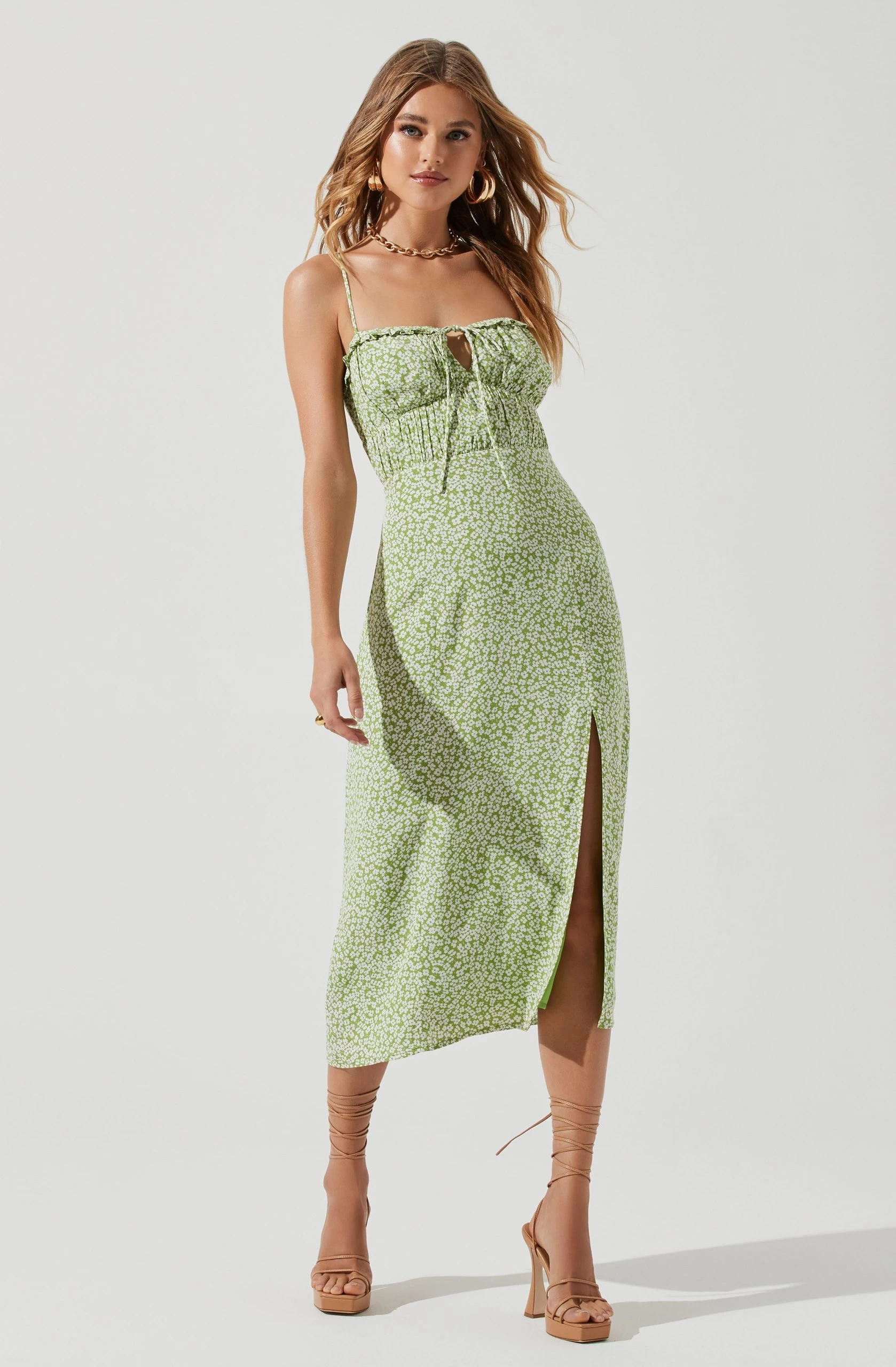 This summer-ready dress features a ditsy floral print throughout and a square neckline with ruffle trim and keyhole accent. Ruched bodice leads to a defined waist and midi skirt with a side slit accent. Cutout back with tying straps. Adjustable straps.