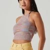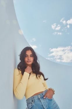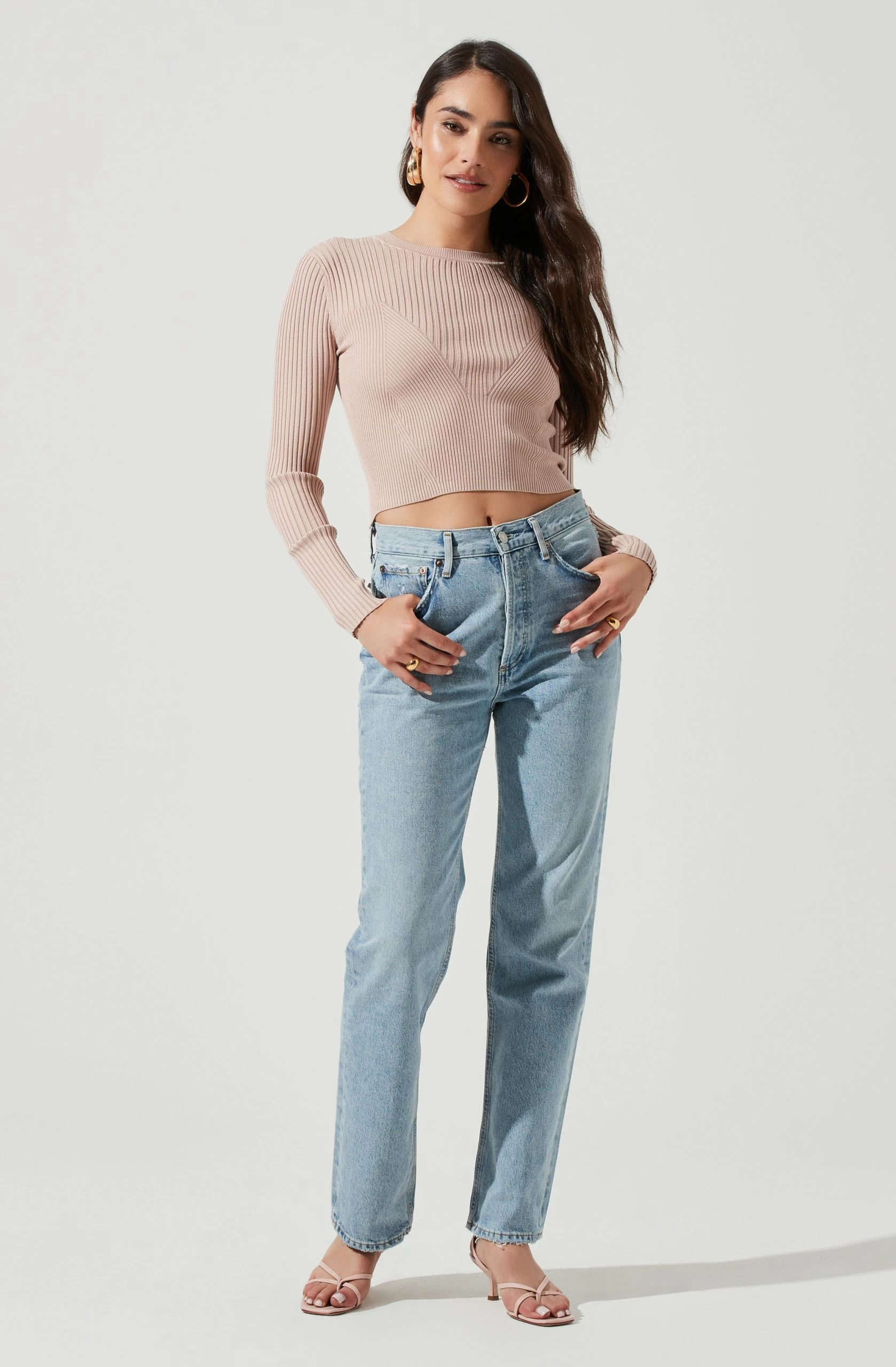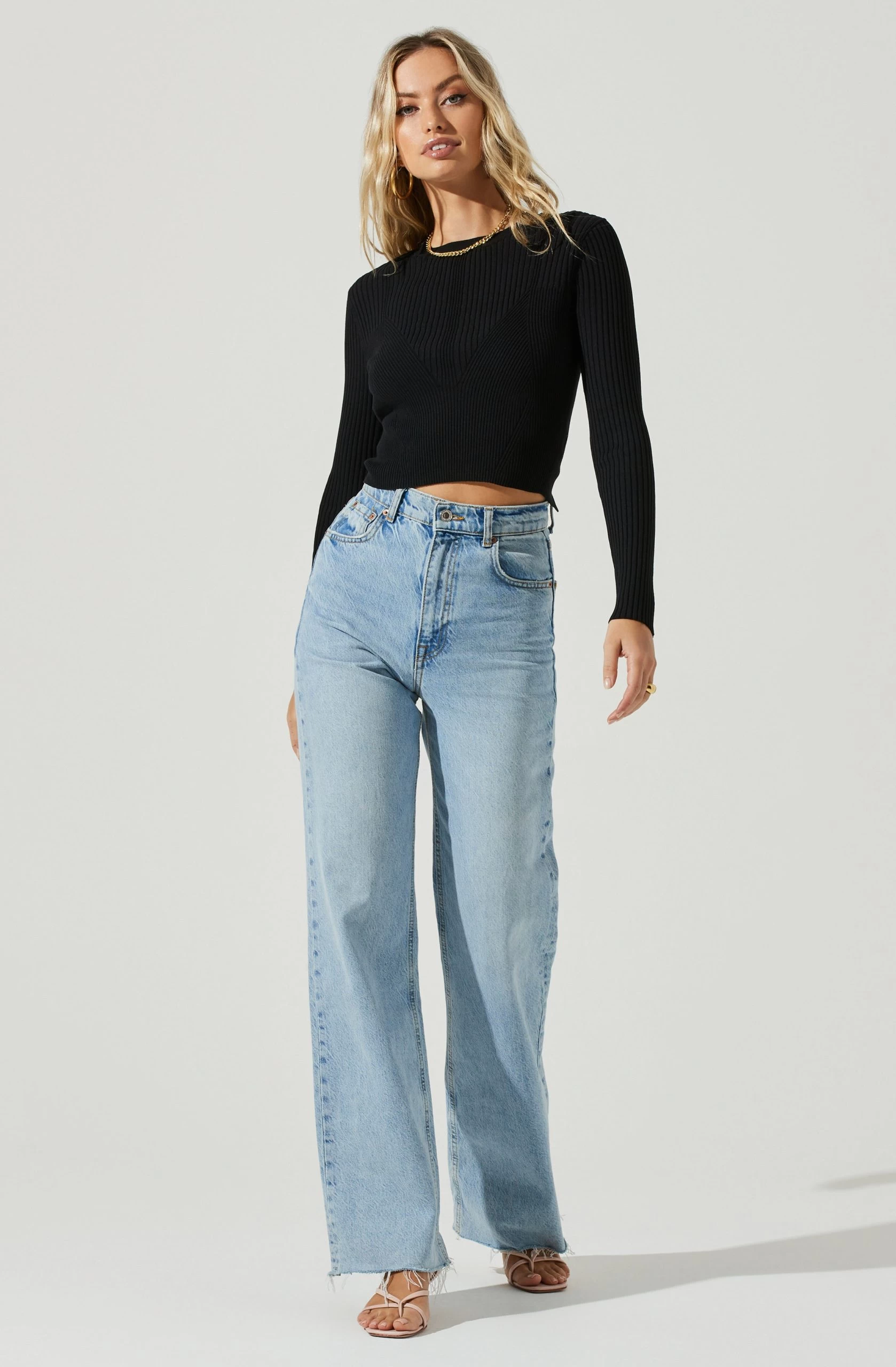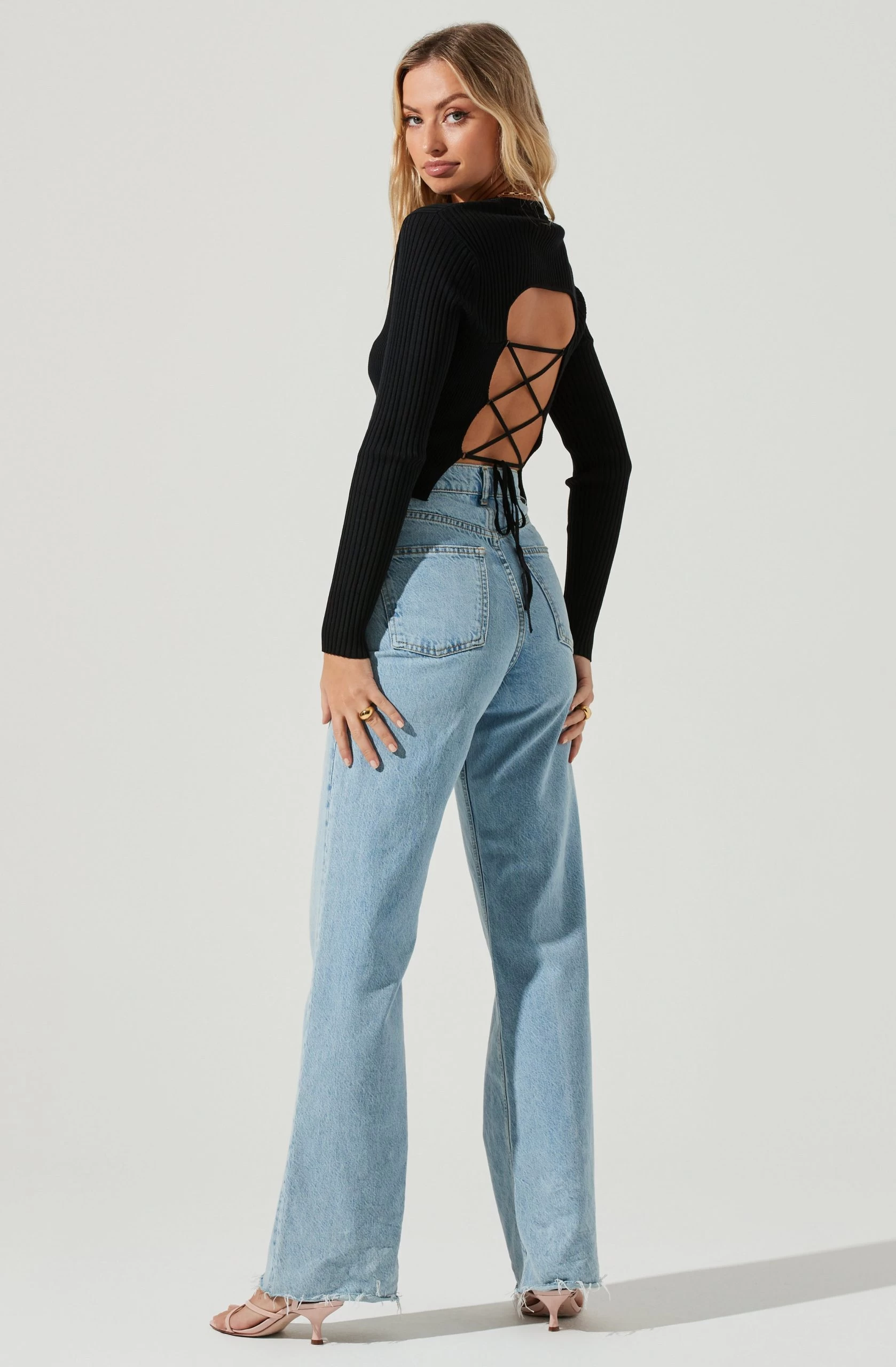 The Avila Sweater features a ribbed knit construction that starts with a round collar and fitted silhouette. Open back with cross strap accents. Long sleeves. Cropped.