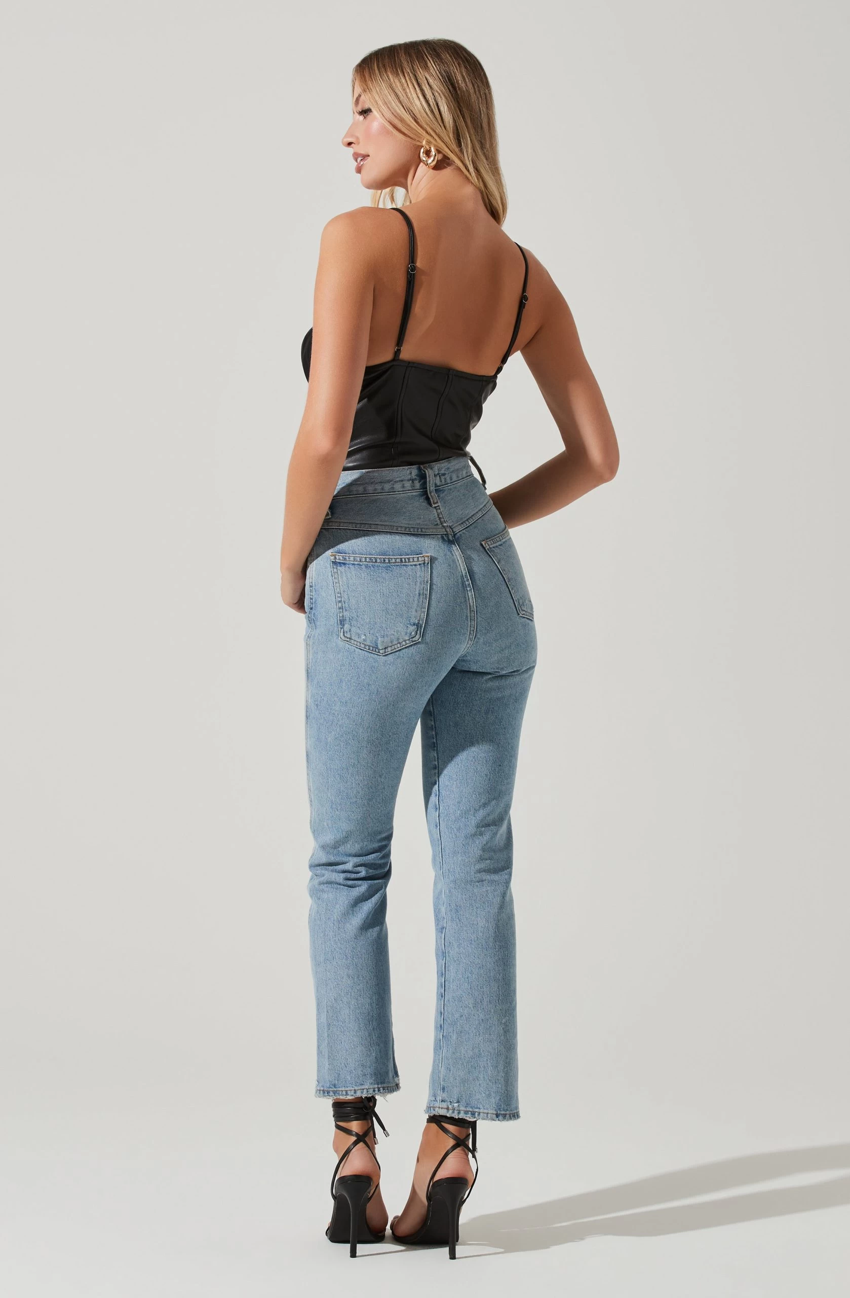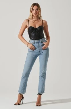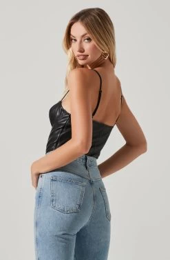 The Bethany Bodysuit features a faux leather construction. Sweetheart neckline leads to a cupped bust and darted bodice. Adjustable shoulder straps. Attached bottoms have snap button closures.
