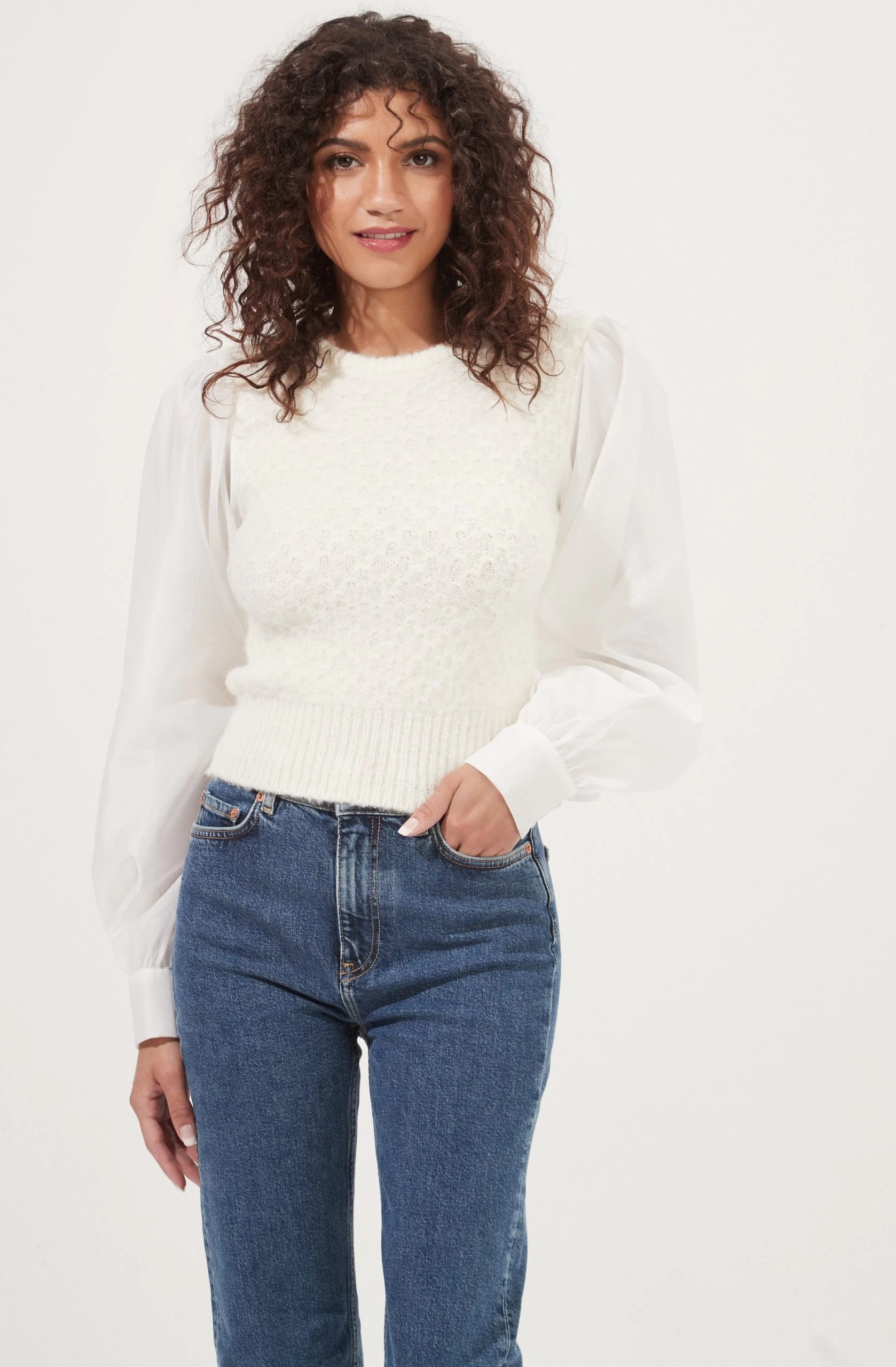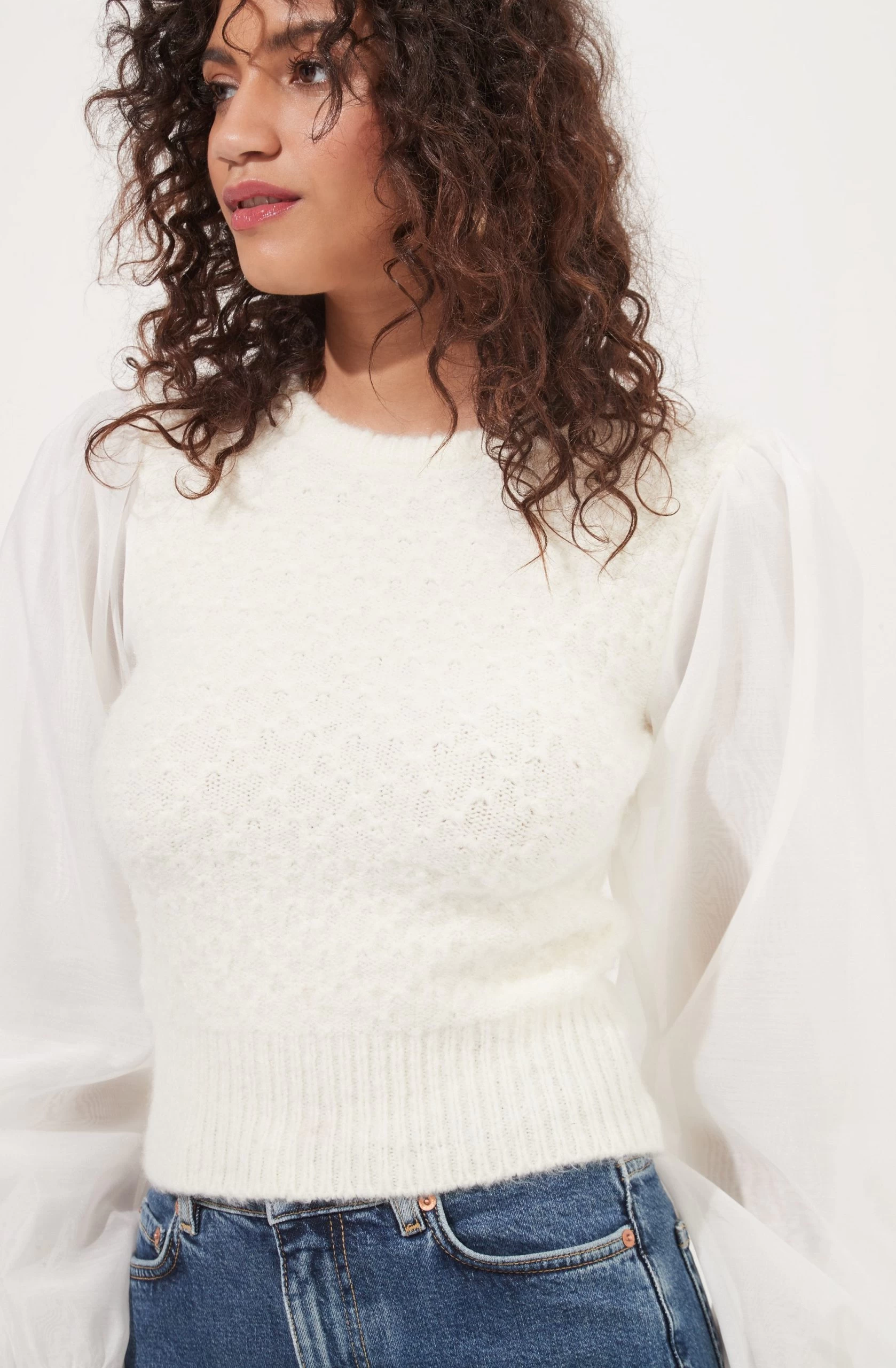 This statement sweater features a fuzzy knit bodice with a cable knit pattern throughout. Long semi-sheer contrast fabric puff sleeves with buttoned cuffs.