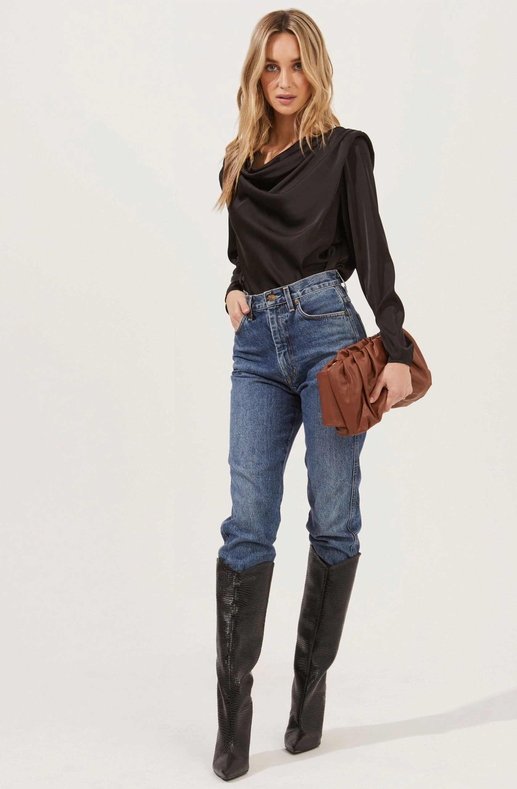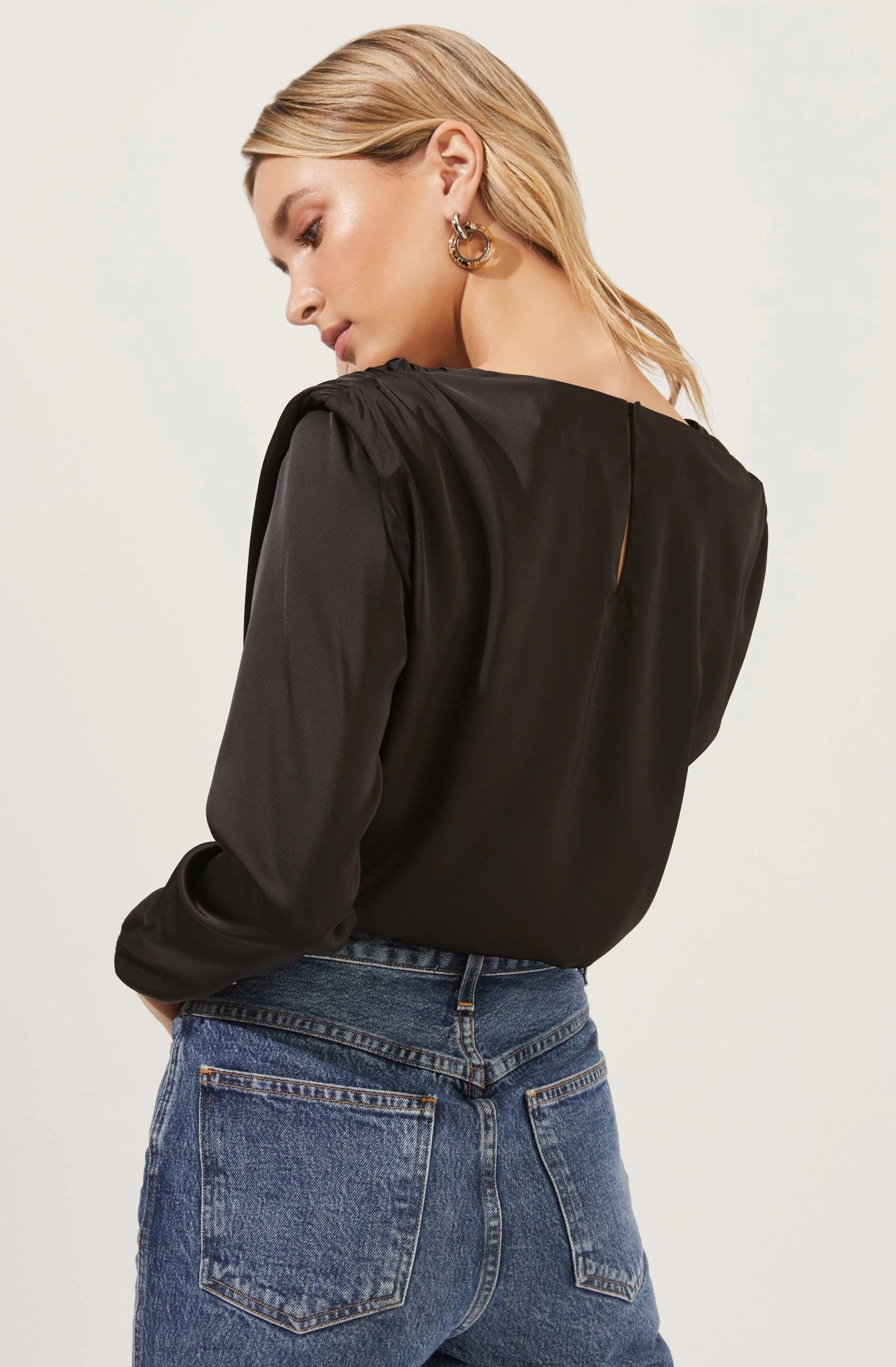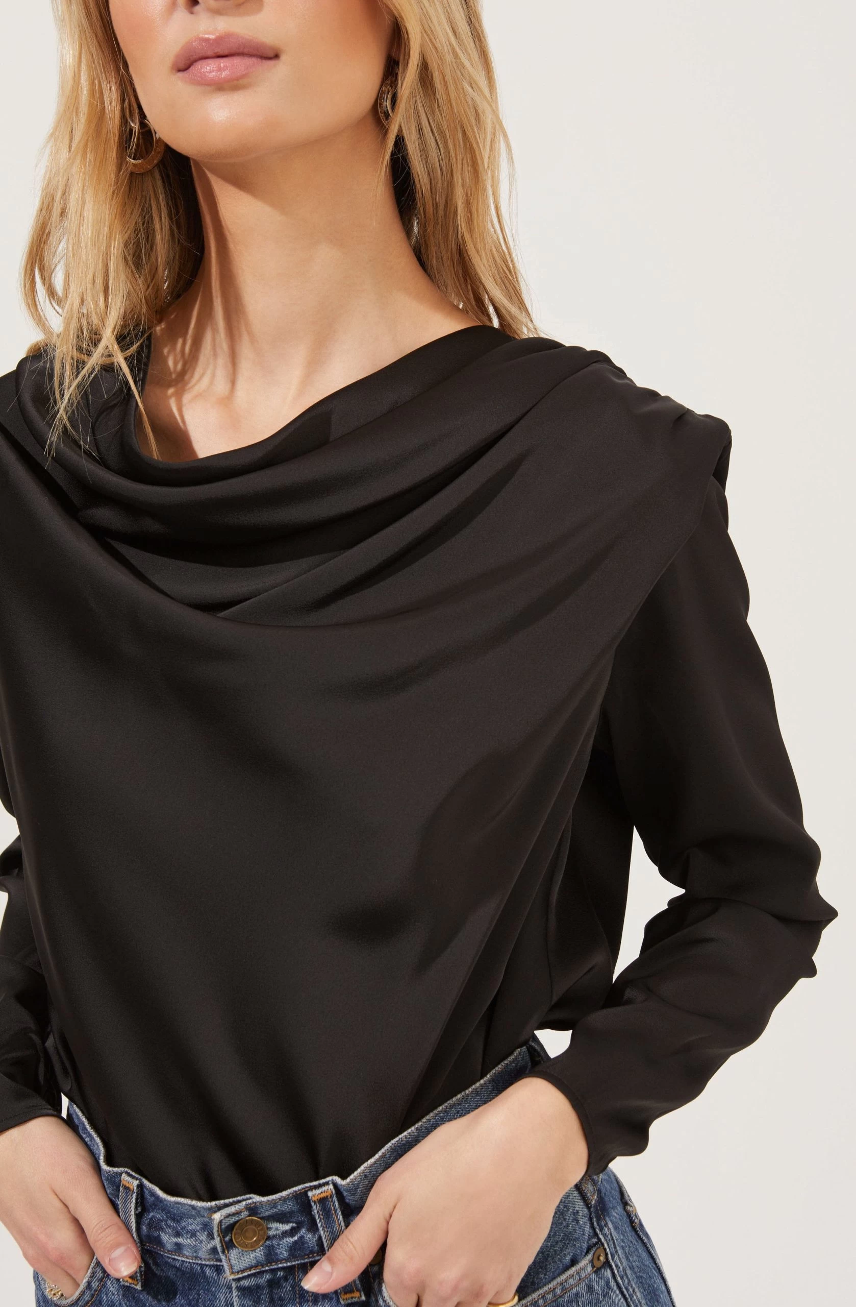 This sleek bodysuit features a round collar with draped details along the front. Padded shoulders make a statement and lead to long fitted sleeves. Keyhole back. Attached thong bottoms include snap button closures.