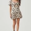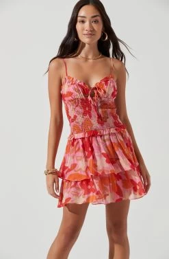 The Blossom Dress features a bright floral print throughout. Sweetheart neckline features a delicate ruffle trim and leads to a front cutout with tying drawstrings. Smocked waist leads to a tiered skirt. Adjustable straps. Fully lined. No zip closure.