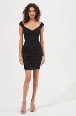 The Bradbury dress features an off-shoulder neckline that descends to a cupped bust and bodycon silhouette. Ruching throughout.