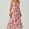 The Bridget Dress features a scoop neckline that features a ballerina bow tie accent at the front. Cinched side cutout accents. Tiered midi skirt. Concealed back zip closure.