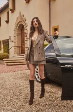 The Brina Blazer features a statement plaid print design. Notched collar leads to a double-breasted front. Long sleeves. Padded shoulders. Fully lined.
