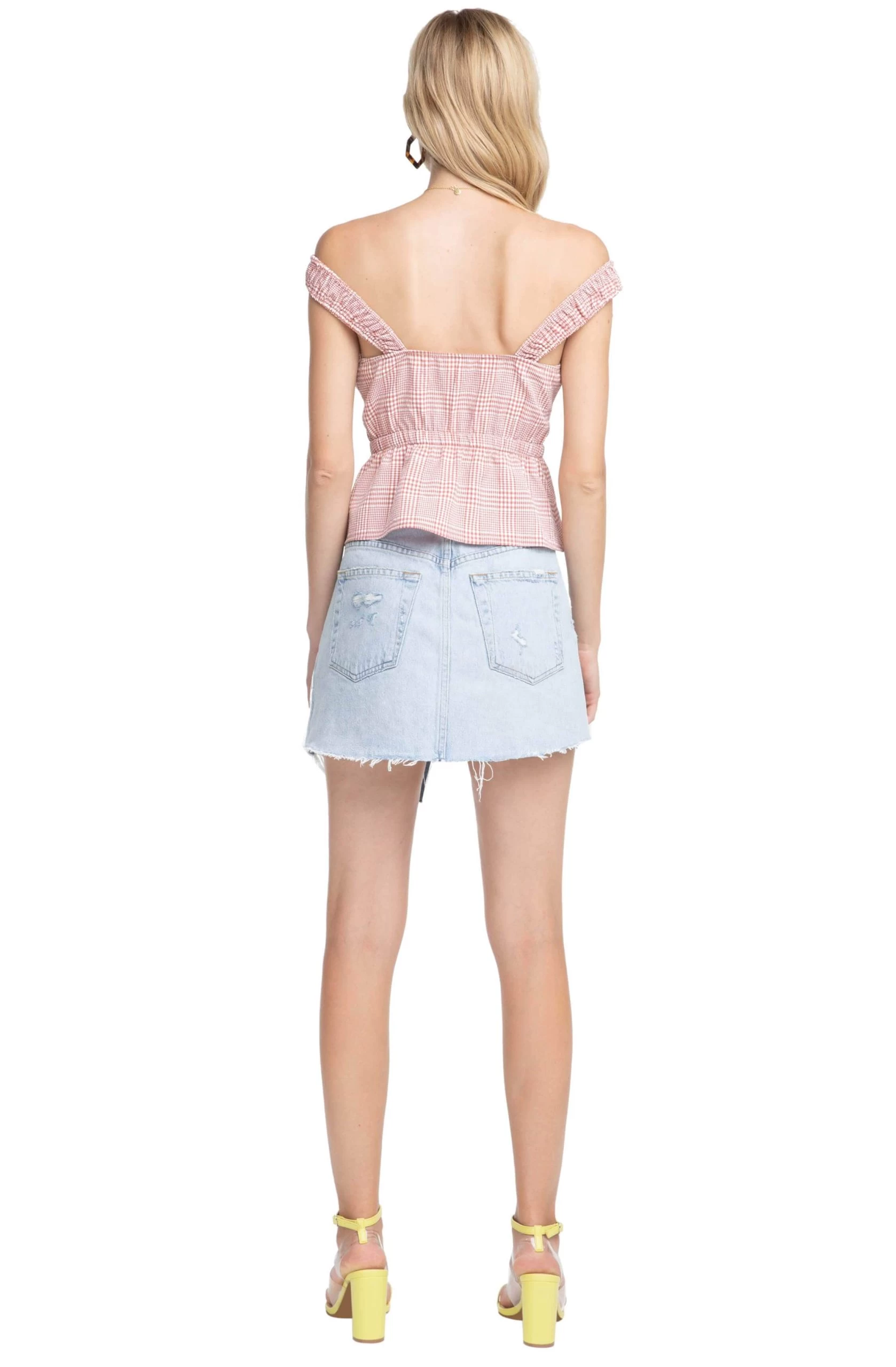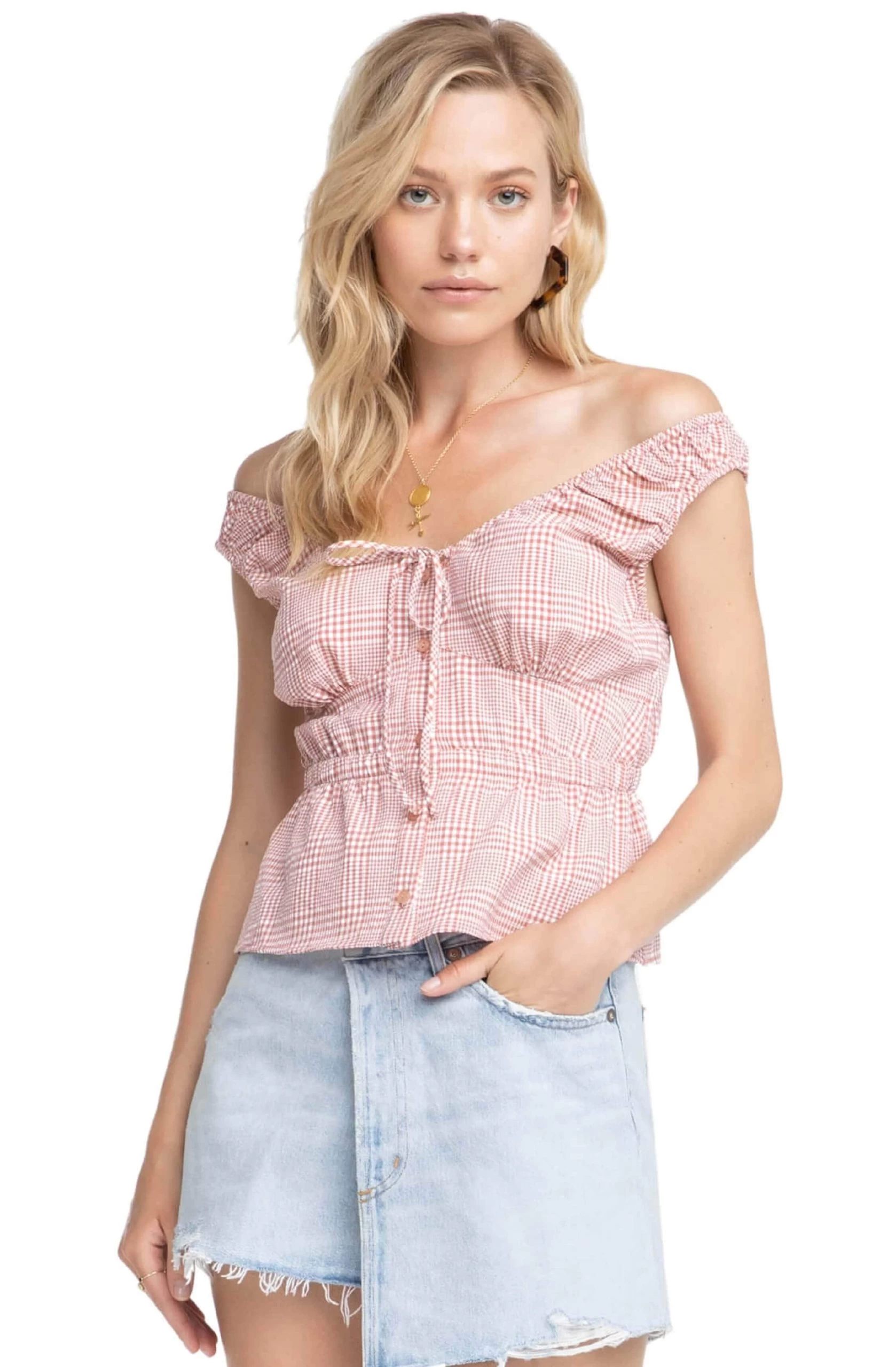 An ultra chic gingham print top with an off-shoulder neckline and tie front accent is the ideal look for sunny days. Seamed bust and front button accents lead to a cinched waist and slightly flared hem. Ruched shoulder straps.