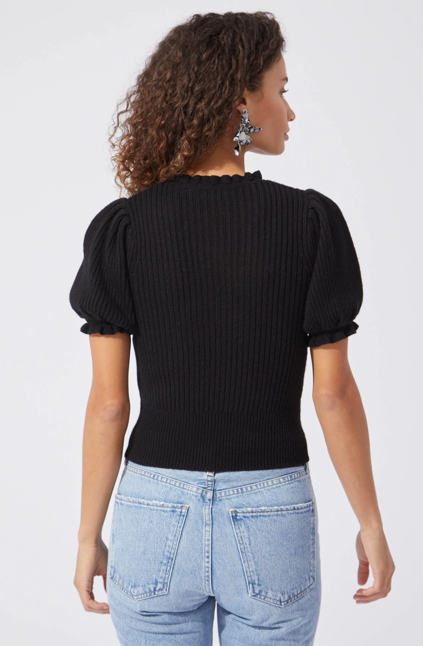 The Caitlyn sweater features a ribbed knit design with a ruffle collar and short puff sleeves.