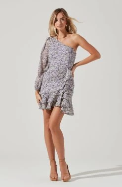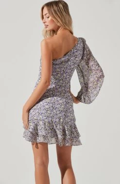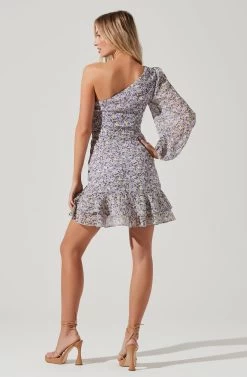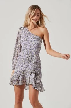 The Cara Dress features a single long sleeve and cutout neckline. Darted bodice leads to a tiered ruffle mini skirt.