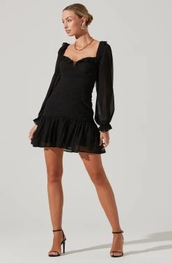 The Carmella Dress features a sweetheart neckline that leads to a wired, notched accent to the bust. Ruched bodice leads to a drop waist and mini skirt. Long sheer sleeves. Tie strap accent on the back. Concealed back zip closure. Fully lined.