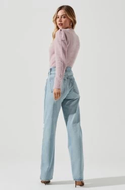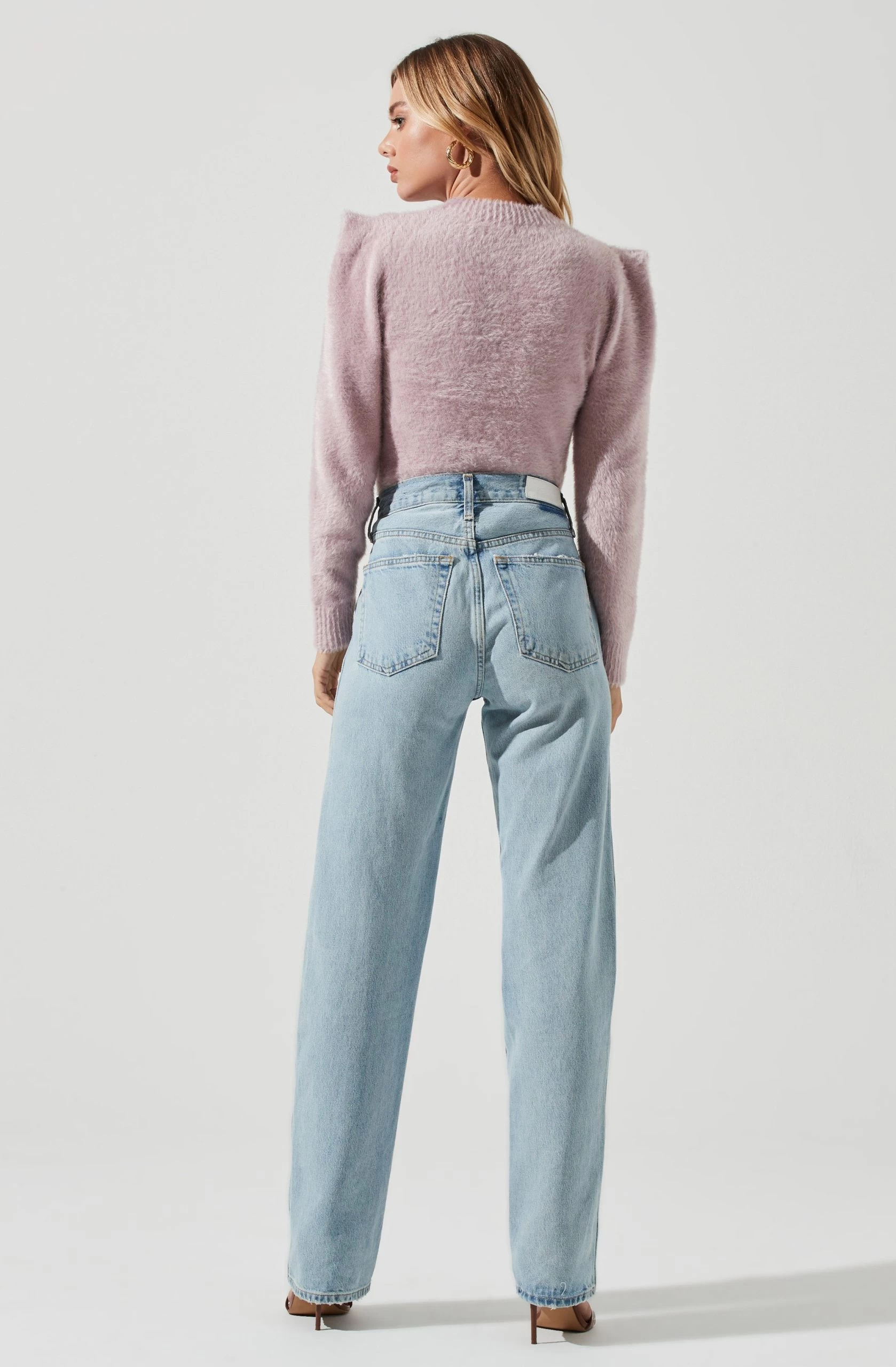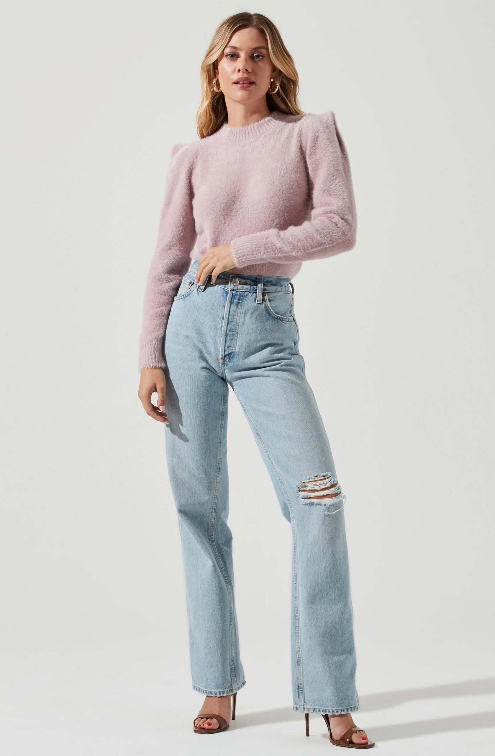 Fuzzy knitwear are here for the holidays. The Caroline Sweater features a classic crew neckline with a fitted silhouette and long sleeves with statement shoulders.