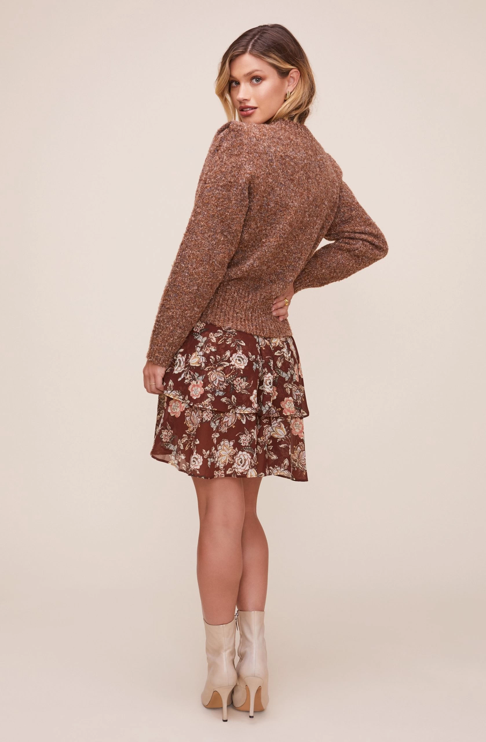 Your cozy knit gets a modern twist. The Caroline Sweater features a crew neckline that descends to a relaxed bodice and fitted waist. Statement shoulders lead to long sleeves.