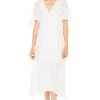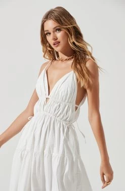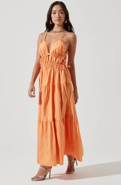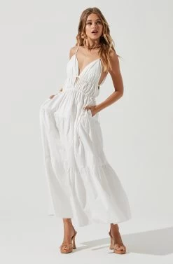 The Cassie Dress features a plunge neckline that leads to a cinched bodice with drawstring accents. Tiered maxi skirt. Side pockets.