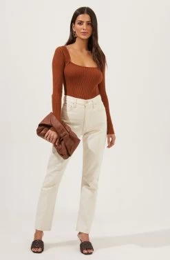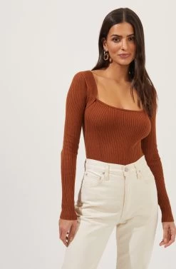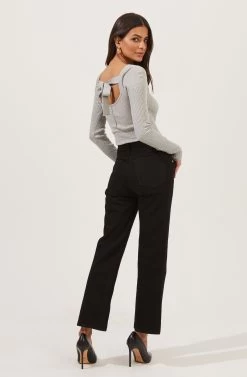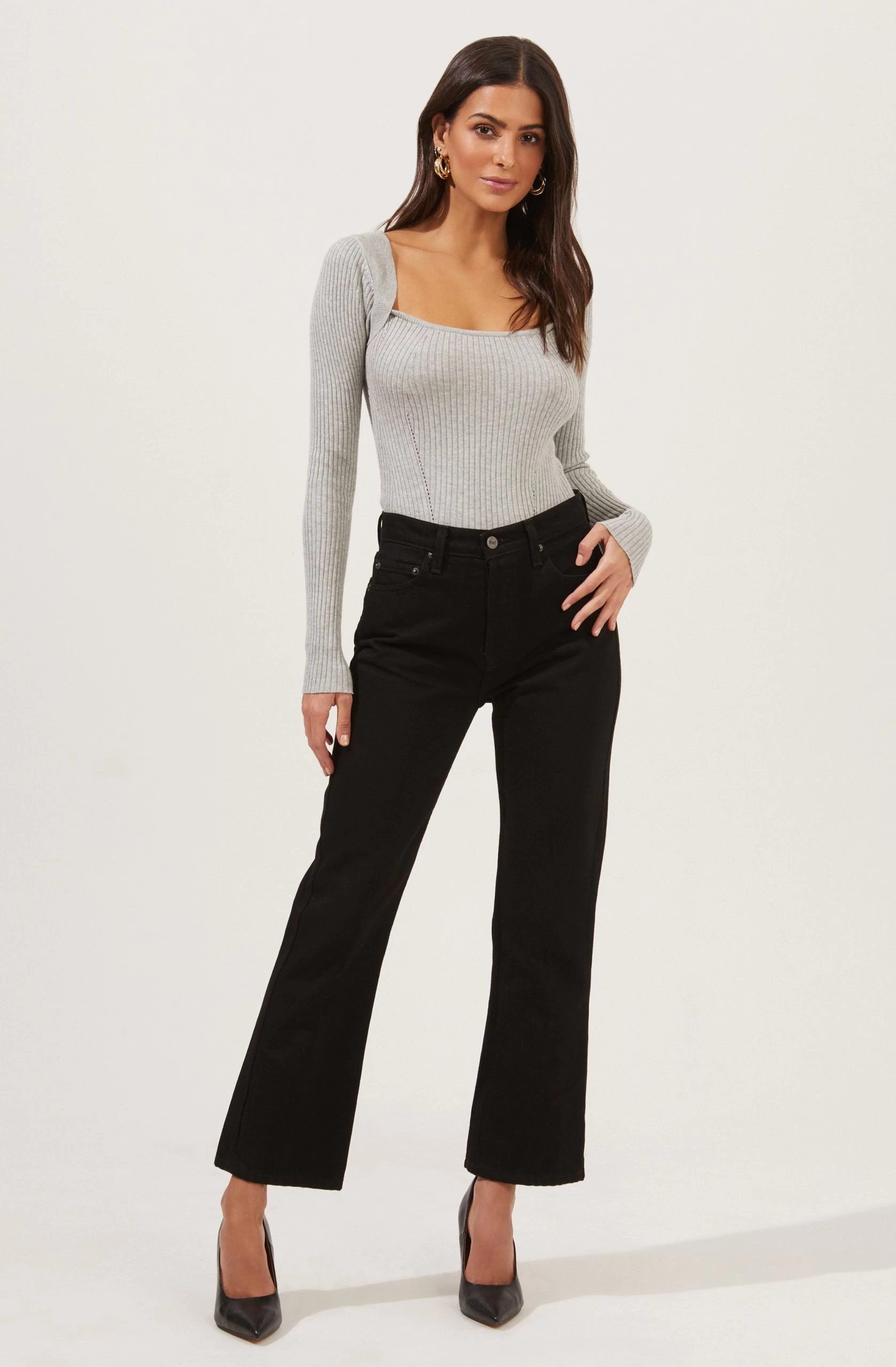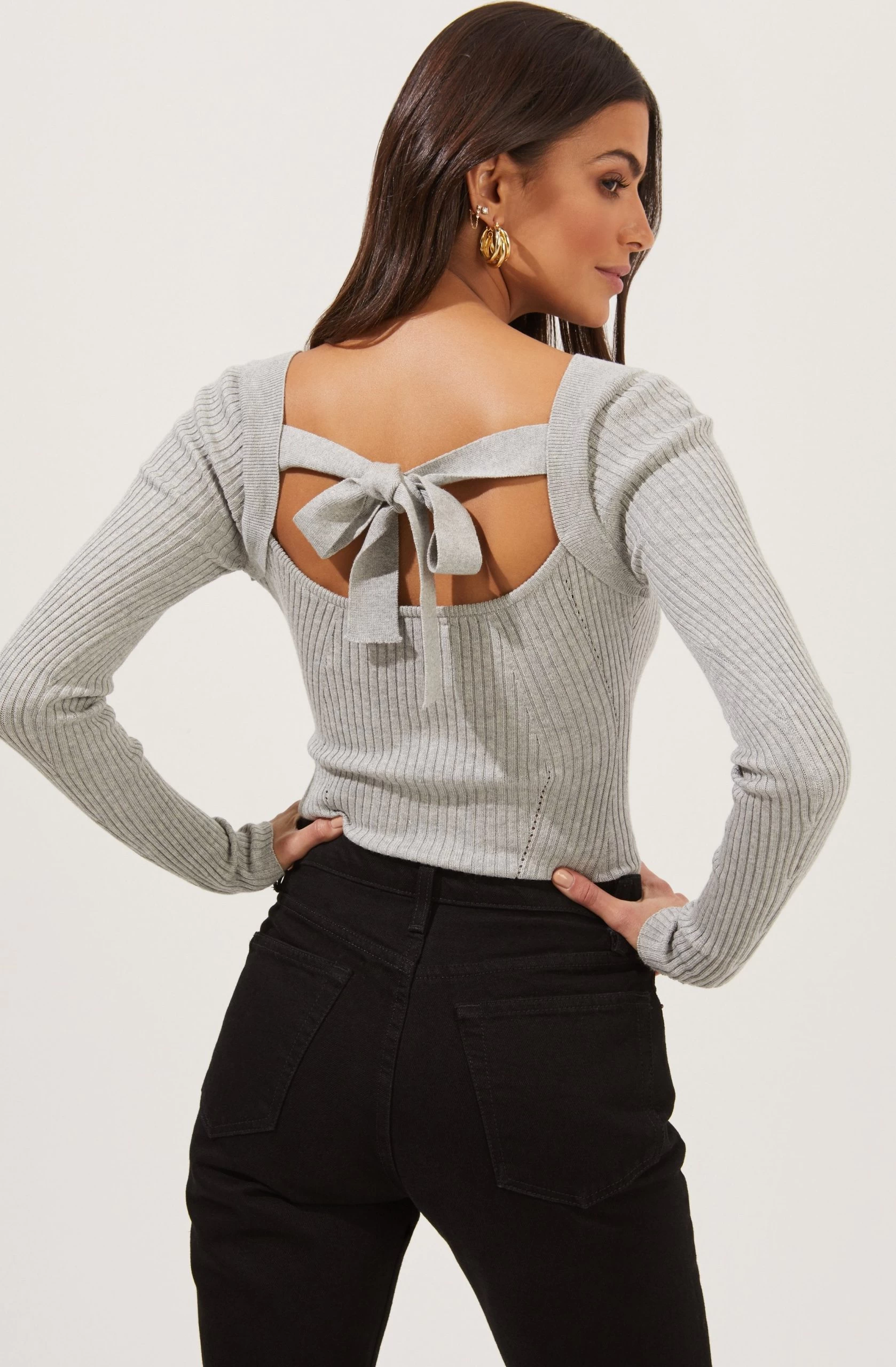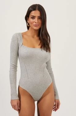 This knit bodysuit features a square neckline. Cutout back features a tie back accent. Long sleeves. Attached bottoms have snap button closures.