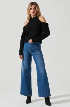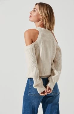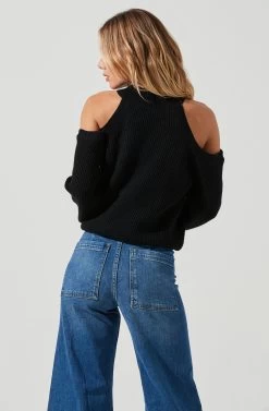 This knit sweater features a mock neck that leads to cutout cold shoulders and long sleeves.