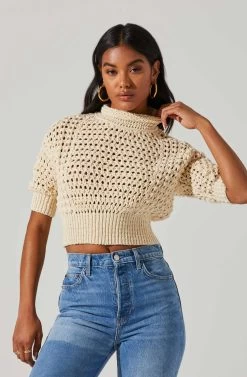 This short sleeve sweater features an open weave crochet design throughout. Fold over neckline leads to a boxy silhouette. Cropped.