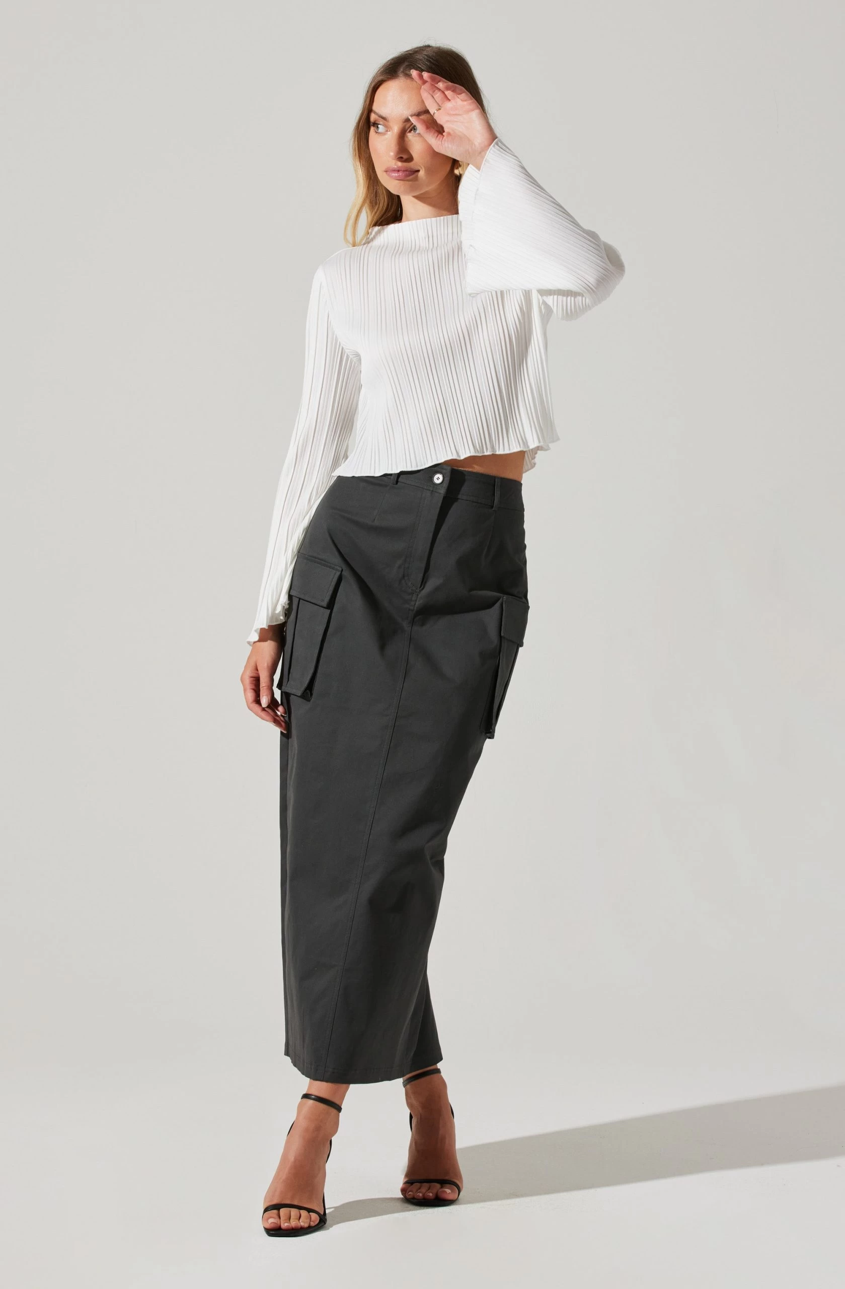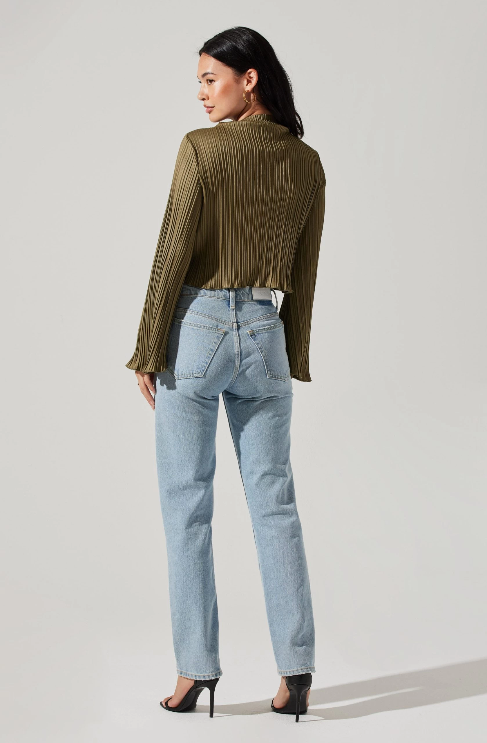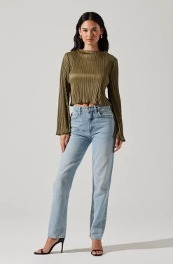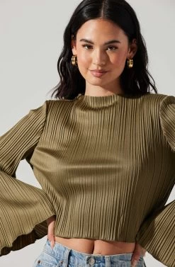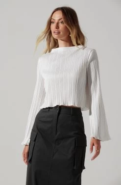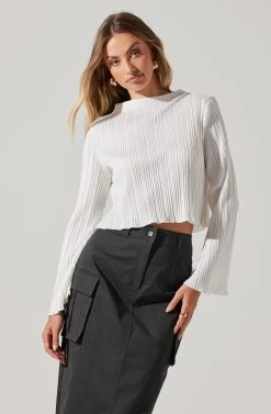 The Cropped Plisse Mock Neck Top boasts unparalleled attention to detail and materials. Its cropped silhouette and pleat texture guarantee a luxurious statement. It blends classic and modern elegance for timeless style.