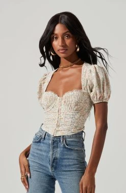 Cupped Floral Short Puff Sleeve Hook And Eye Top