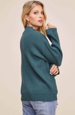 Not your average knit. This striking sweater features a turtleneck collar, asymmetrical cutout accent at the shoulder and long sleeves. Relaxed fit.