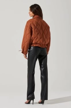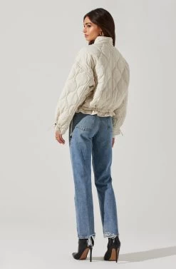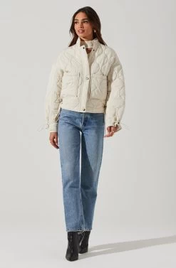 The Dalia Jacket features a quilted finish. High neck leads to a snap button placket at the front. Patch pockets at the side. Long sleeves with cinched drawstring accents at the cuffs.