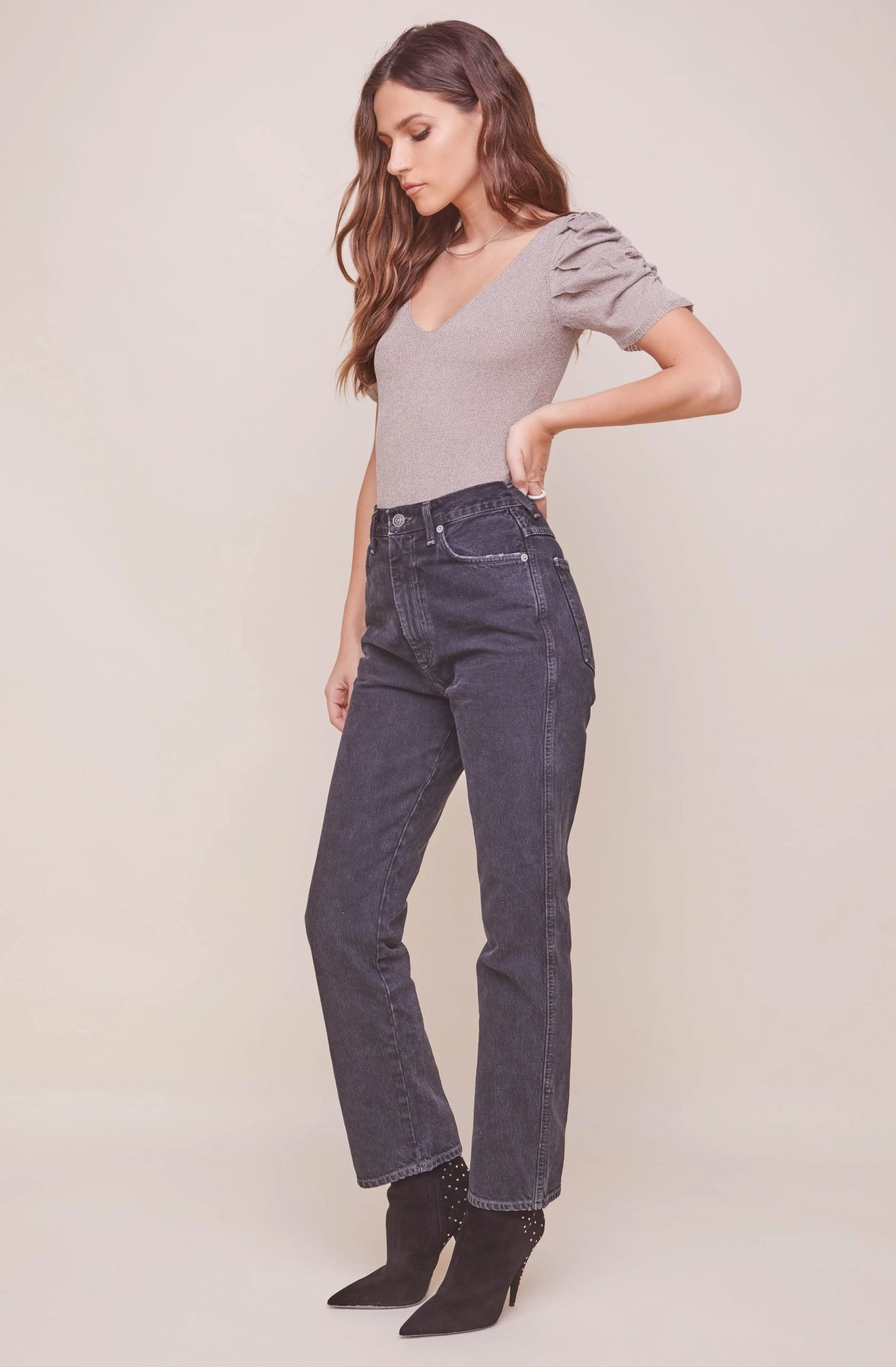 Nothing says fun like metallic bodysuits! The Deidra features a V neckline, ruched, puff sleeves and a fitted bodice.