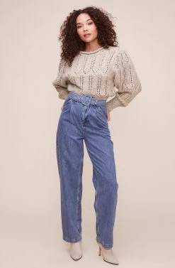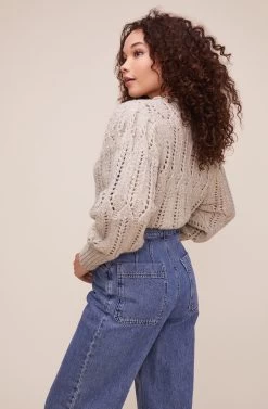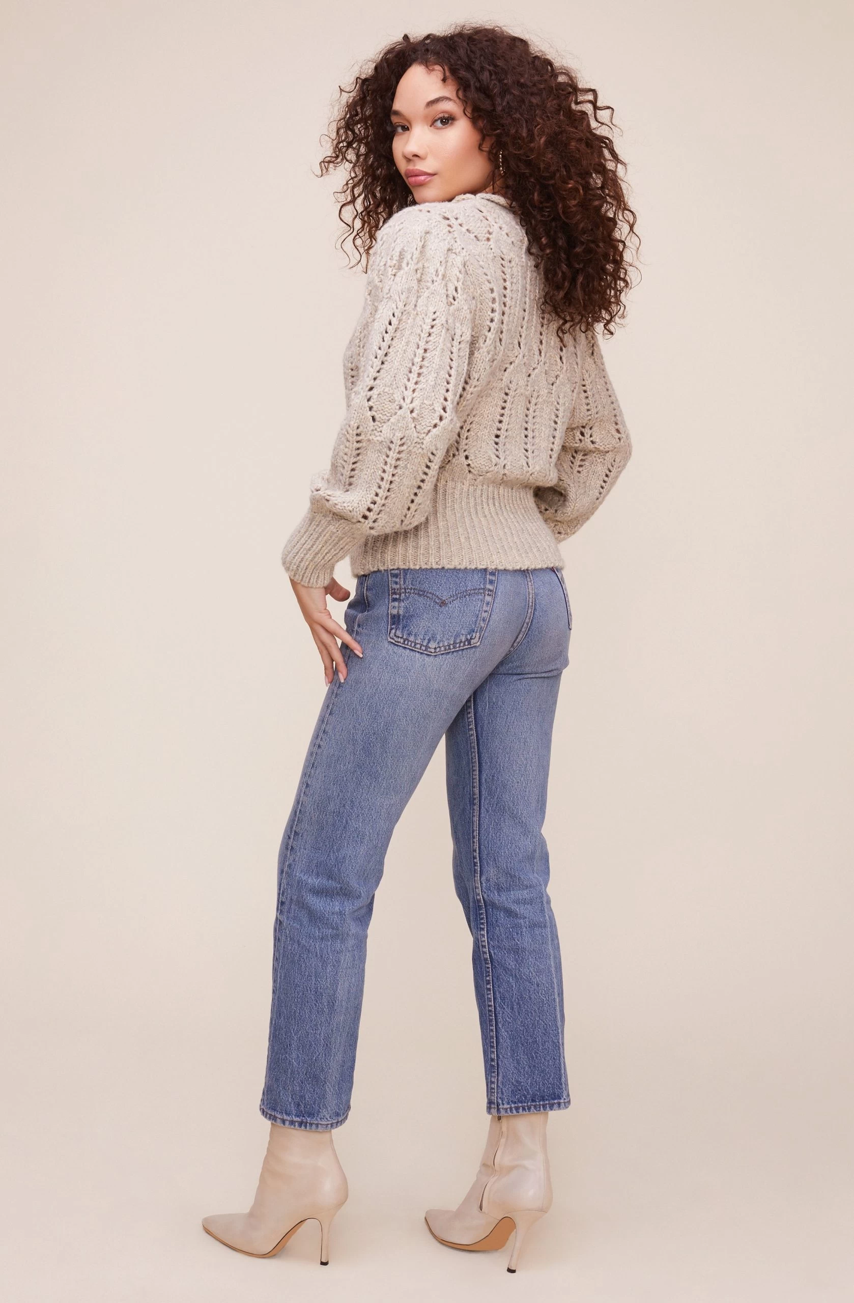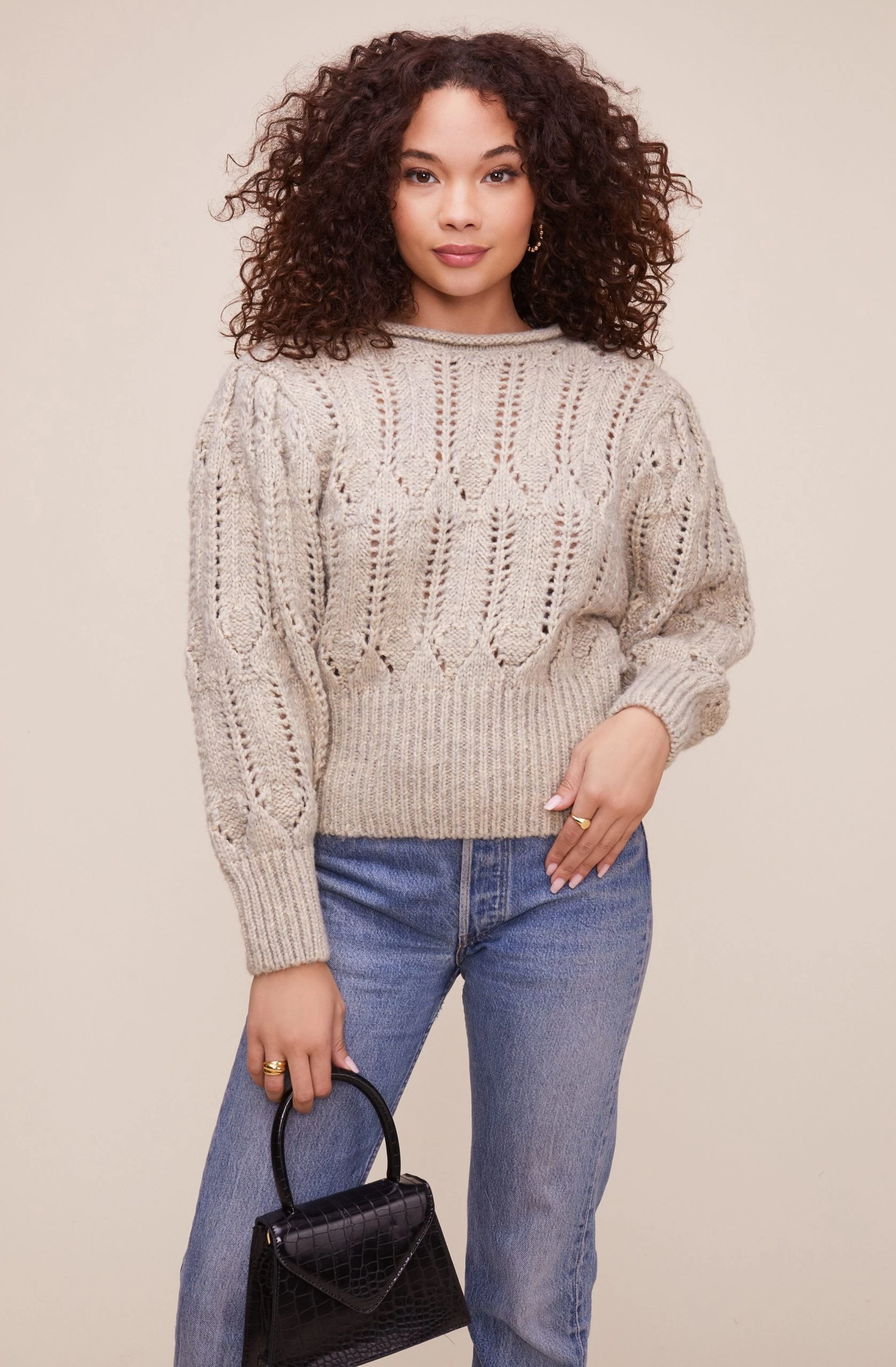 The Dia sweater features a rolled crew neck with an intricate pointelle design along the front, back and sleeves.
