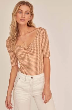 Gingham is back! This bodysuit features a romantic plunge neckline that descends to a ruched bust. Three-quarter sleeves and scoop back detail. Pairs well with chic jeans and mini skirts!