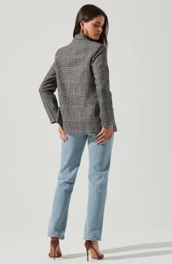 This structured blazer features a notched collar that descends to a double-breasted front with contrast buttons. Flap pockets along the sides. Long sleeves. Shoulder pad.