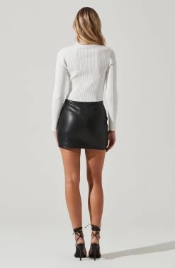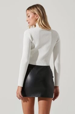 The Elia Sweater features a ribbed knit construction. Mock neck collar leads to a cutout front, ruched bust and cropped hem. Long sleeves.
