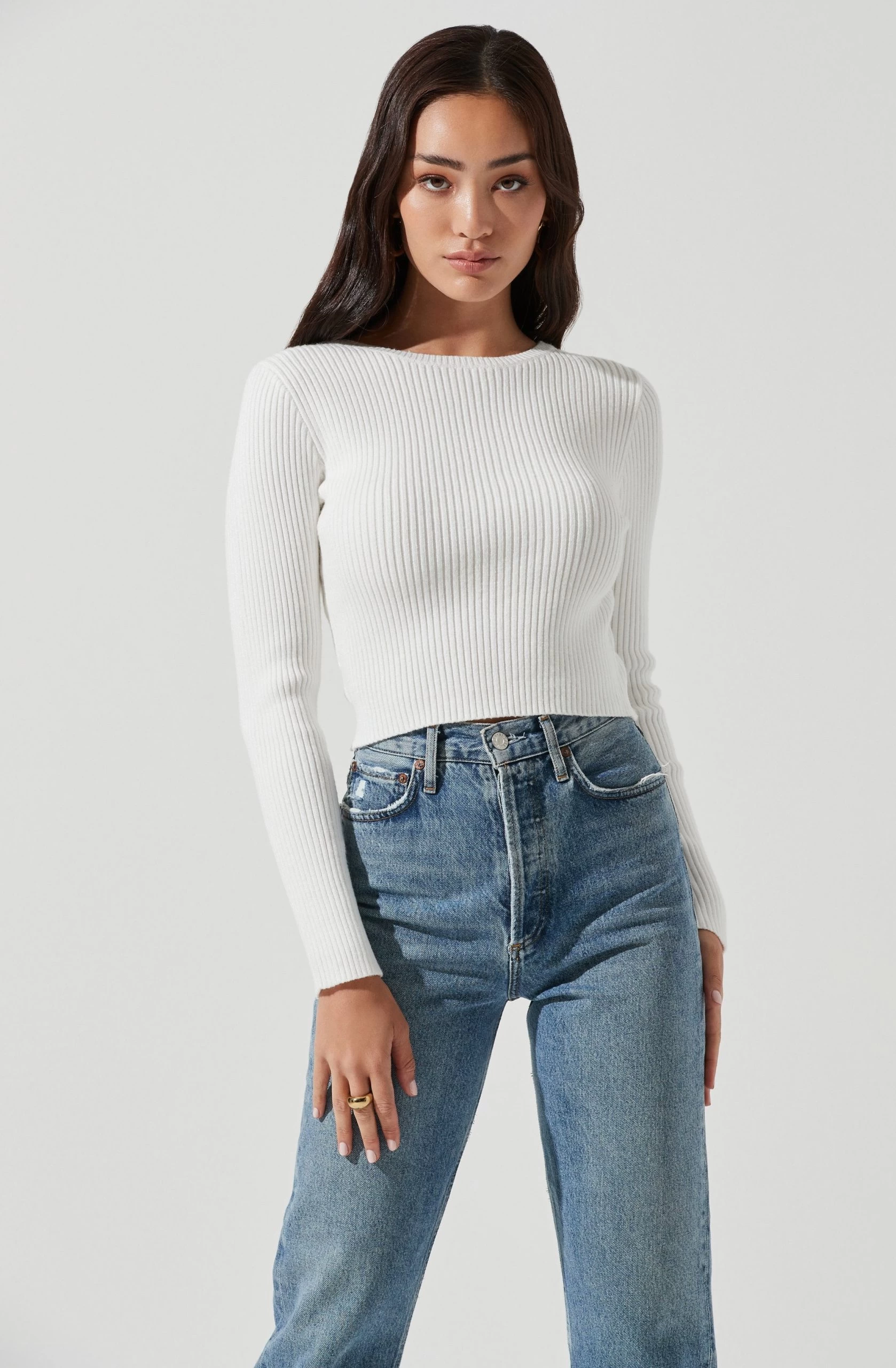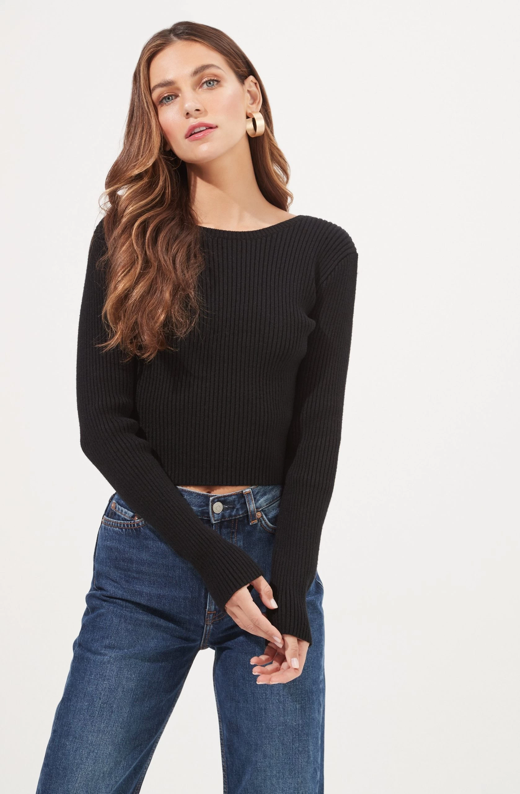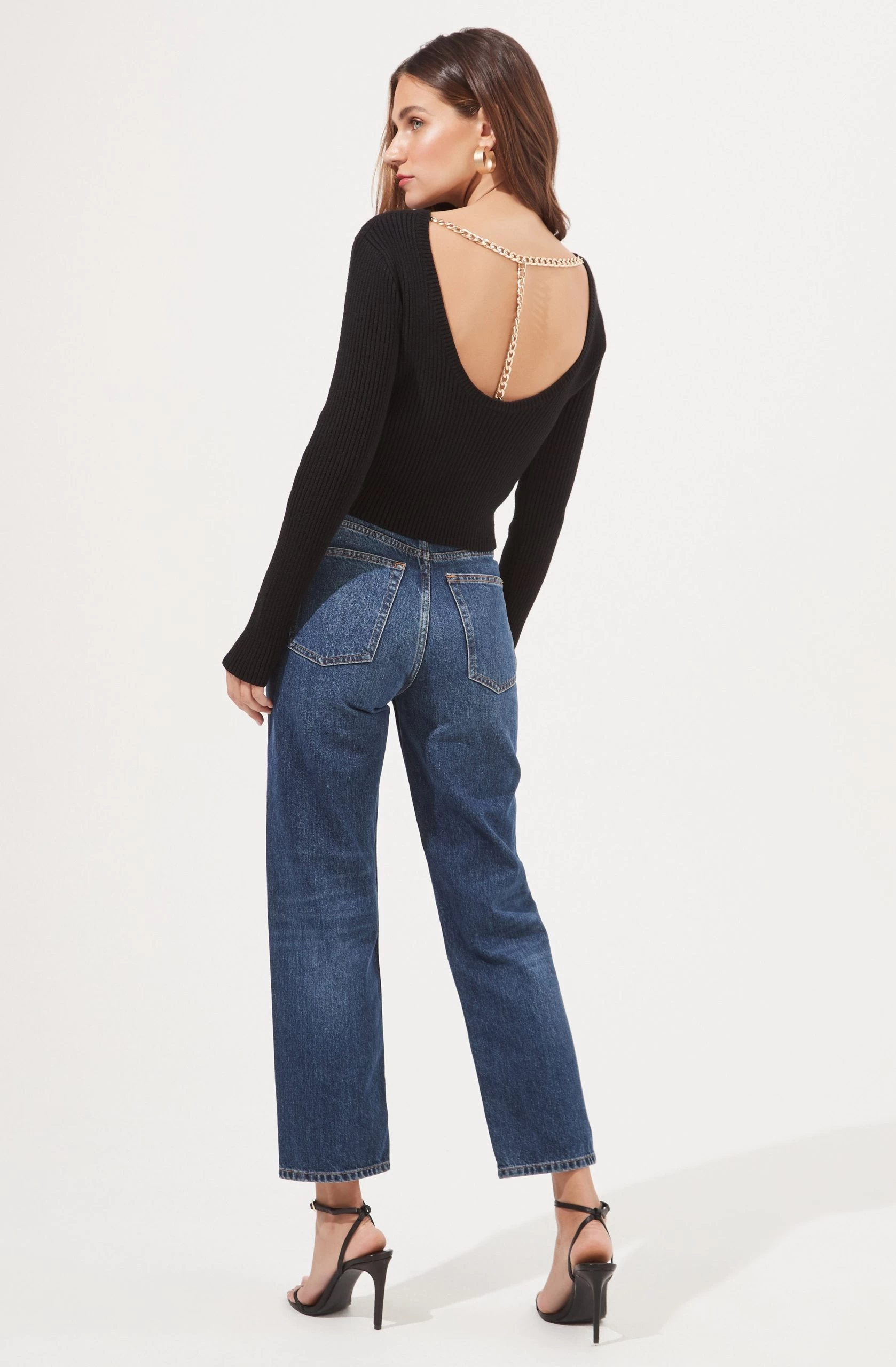 The Elson Sweater features a ribbed knit construction with a round collar and long sleeves. Open back reveals a delicate lariat chain link accent.