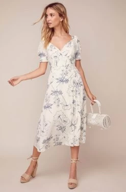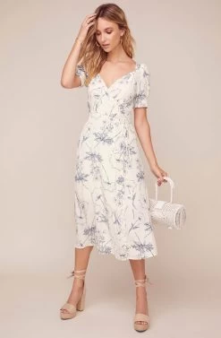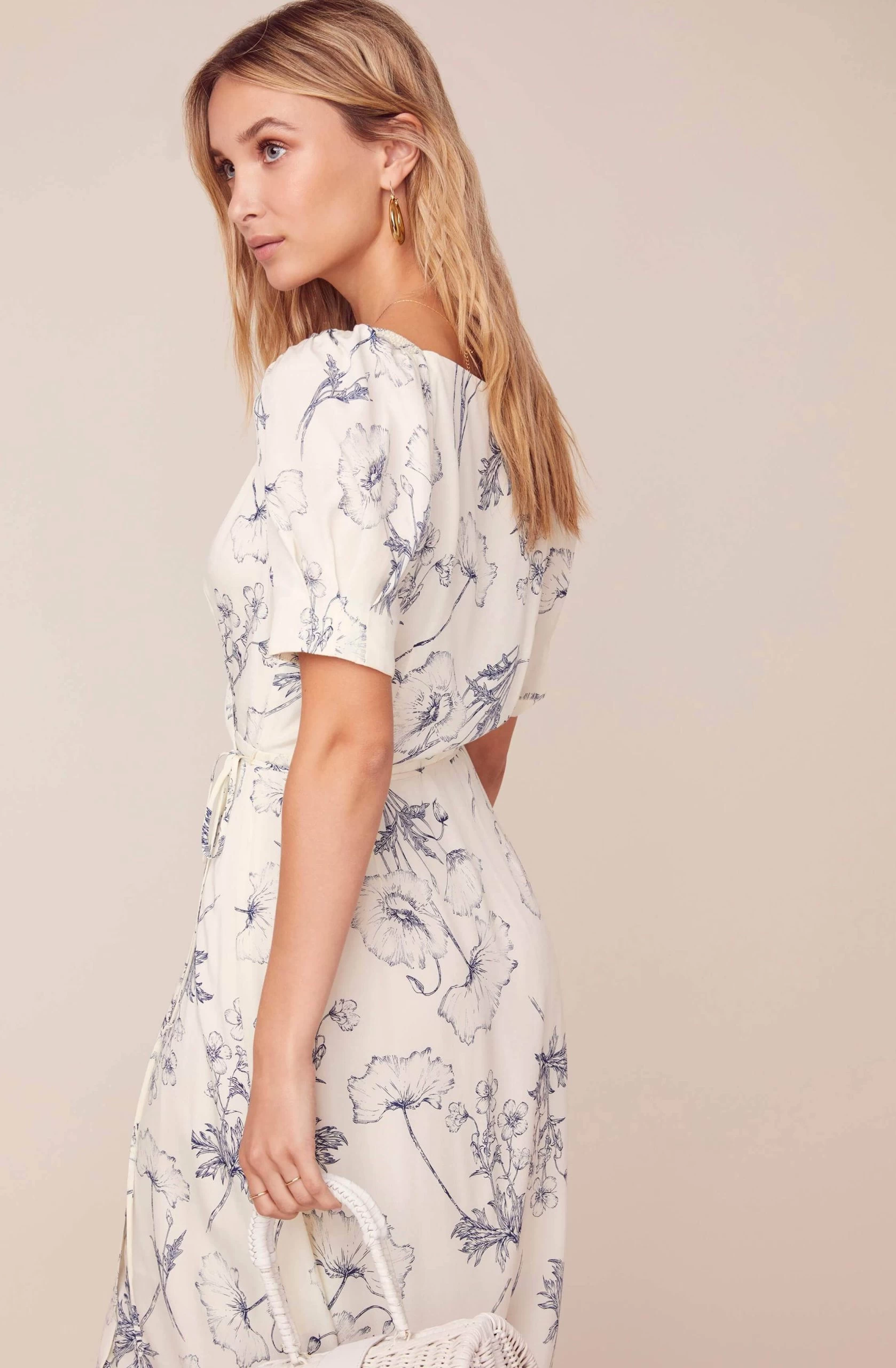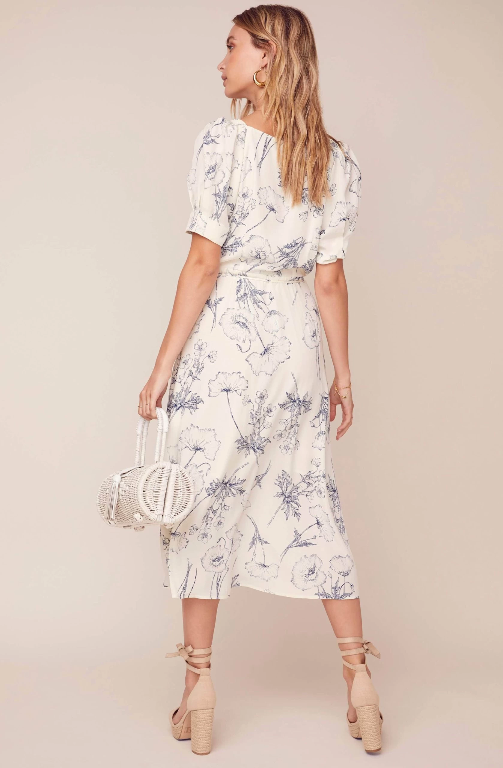 Spring wonder takes hold in the Elysian Dress! This darling number features a V-neckline that is accentuated with a fitted bodice and short puff sleeves. Dainty floral print throughout adds cheer. This style is finished with a flowy midi skirt.