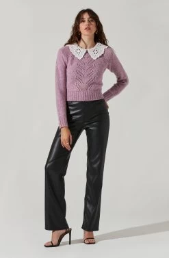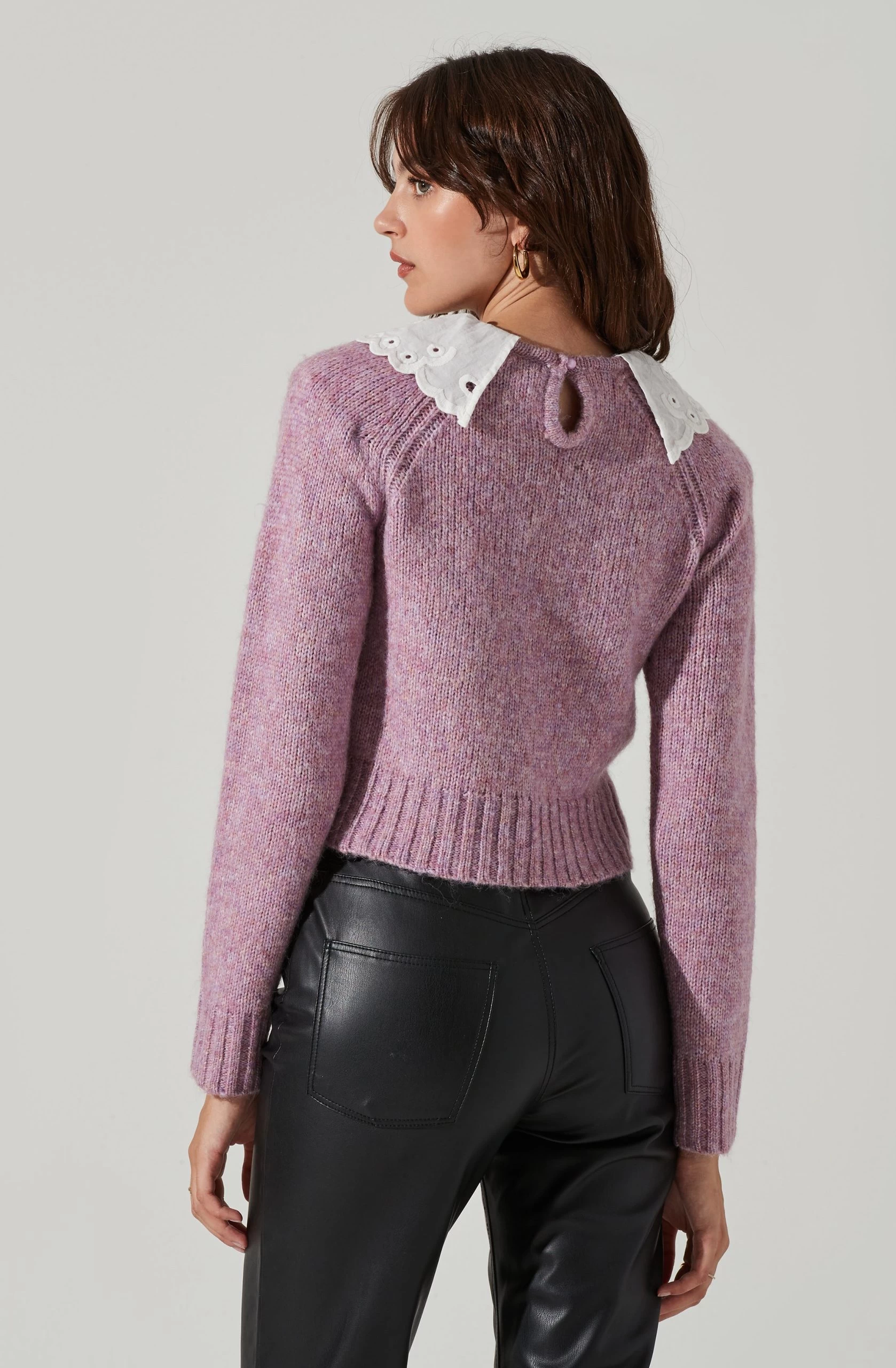 This statement knit sweater features a pointelle design at the front. Statement embroidered collar is attached at the neckline. Long sleeves. Keyhole back.